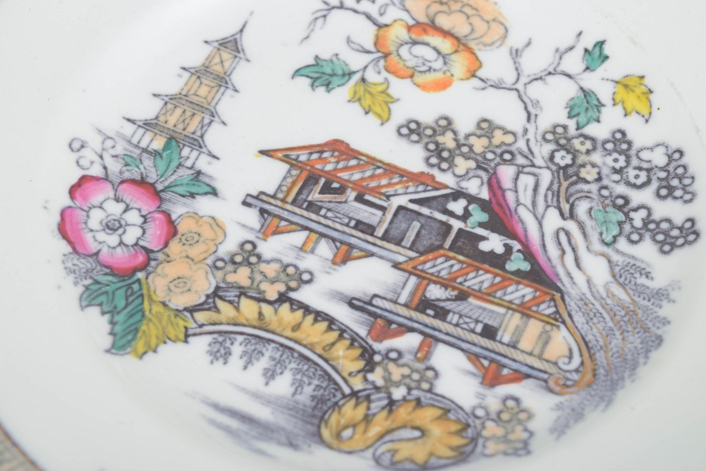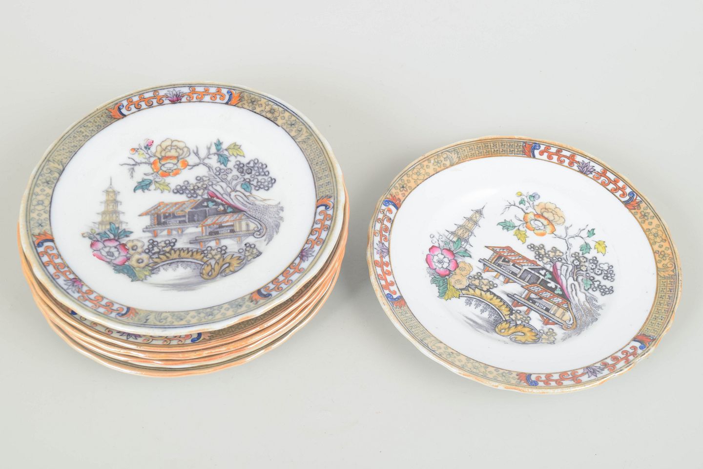 Decorative faience plates featuring the classic “Japan” pattern, hand-painted in a multicoloured palette with Oriental-inspired motifs. Slight age-related yellowing.