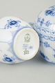 Sæt bestående af flødekande og sukkerskål i musselmalet halvblonde. Begge dele er udført i klassiske riflede former med gennembrudt blondekant og håndmalet koboltblå dekoration. Et harmonisk og elegant sæt til kaffe- og teservering.