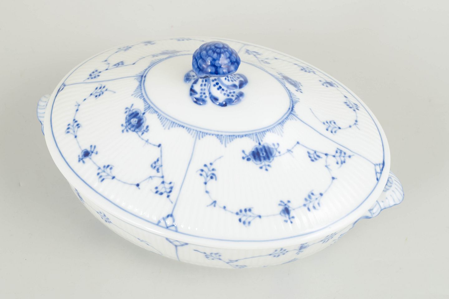 Classic oval tureen in Blue Fluted Plain with matching lid and finial handle. The tureen is made in the traditional fluted form and decorated with hand-painted cobalt blue underglaze in the iconic fluted pattern. An elegant and functional serving piece, suitable for soups, vegetables or hot dishes.