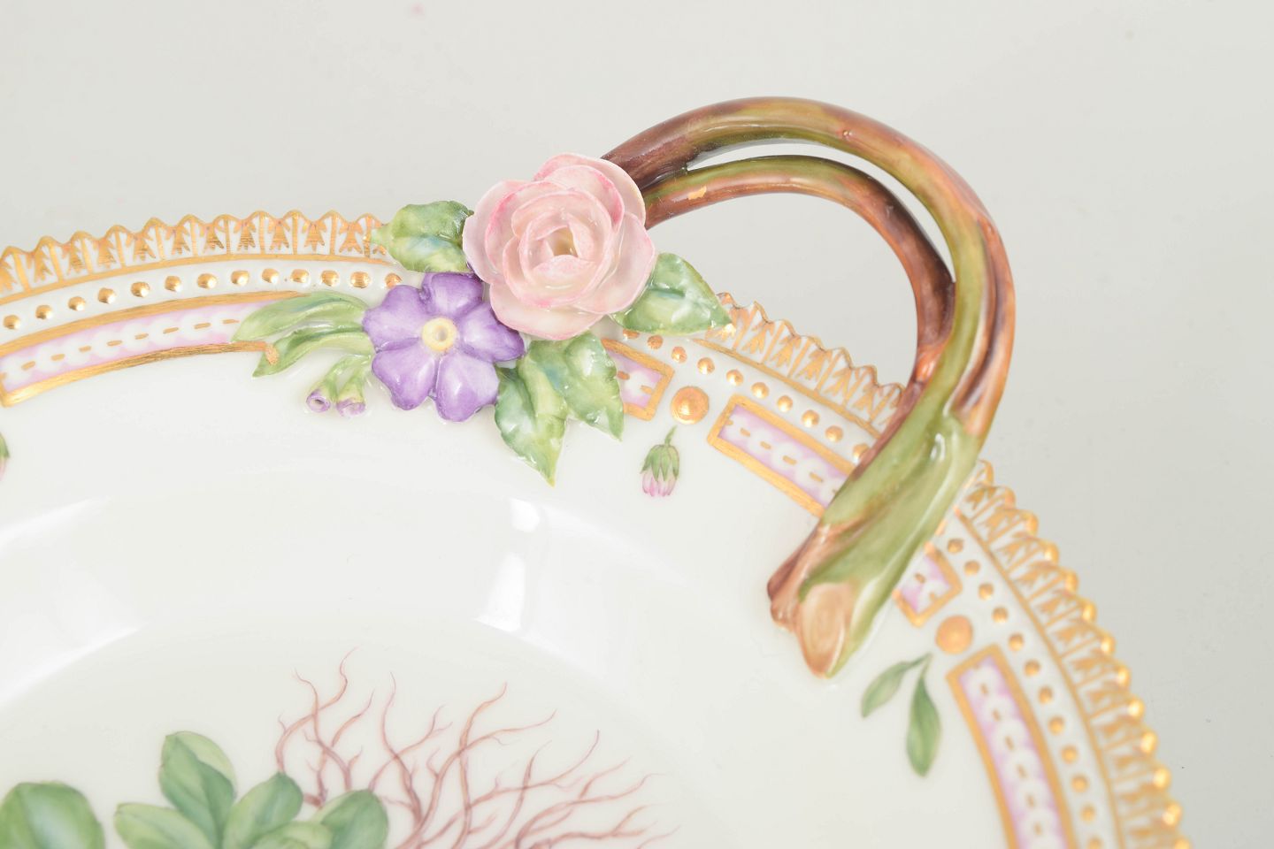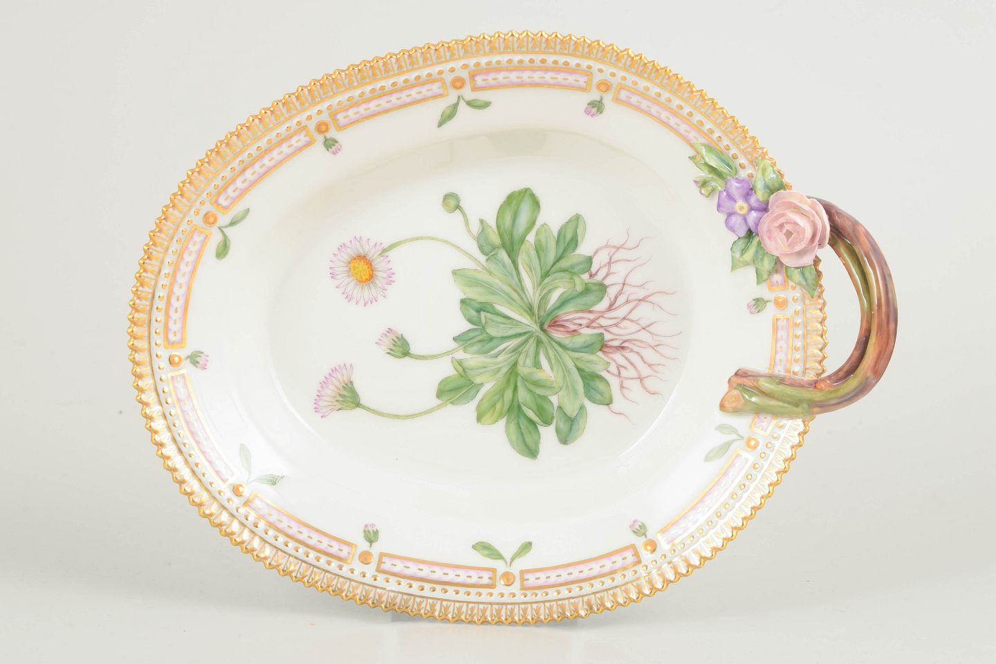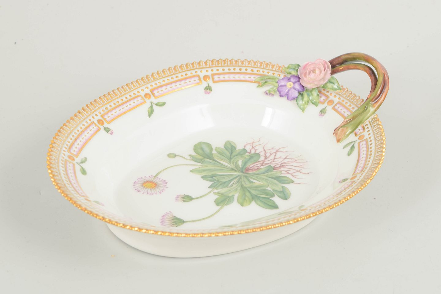 Elegant fad med hank i det ikoniske Flora Danica-stel, håndmalet med botanisk motiv gengivet efter Flora Danica-værket. Fadet er udført i stellets karakteristiske, raffinerede formsprog med dekoreret rand og markant hank, der giver både funktionalitet og et dekorativt udtryk. Velegnet til servering eller præsentation.