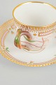 Elegant moccakop med tilhørende underkop i det ikoniske Flora Danica-stel. Koppen er håndmalet med botanisk motiv gengivet efter Flora Danica-værket og udført i stellets karakteristiske, raffinerede formsprog med dekorativ kant. En klassisk og eksklusiv kaffekop.