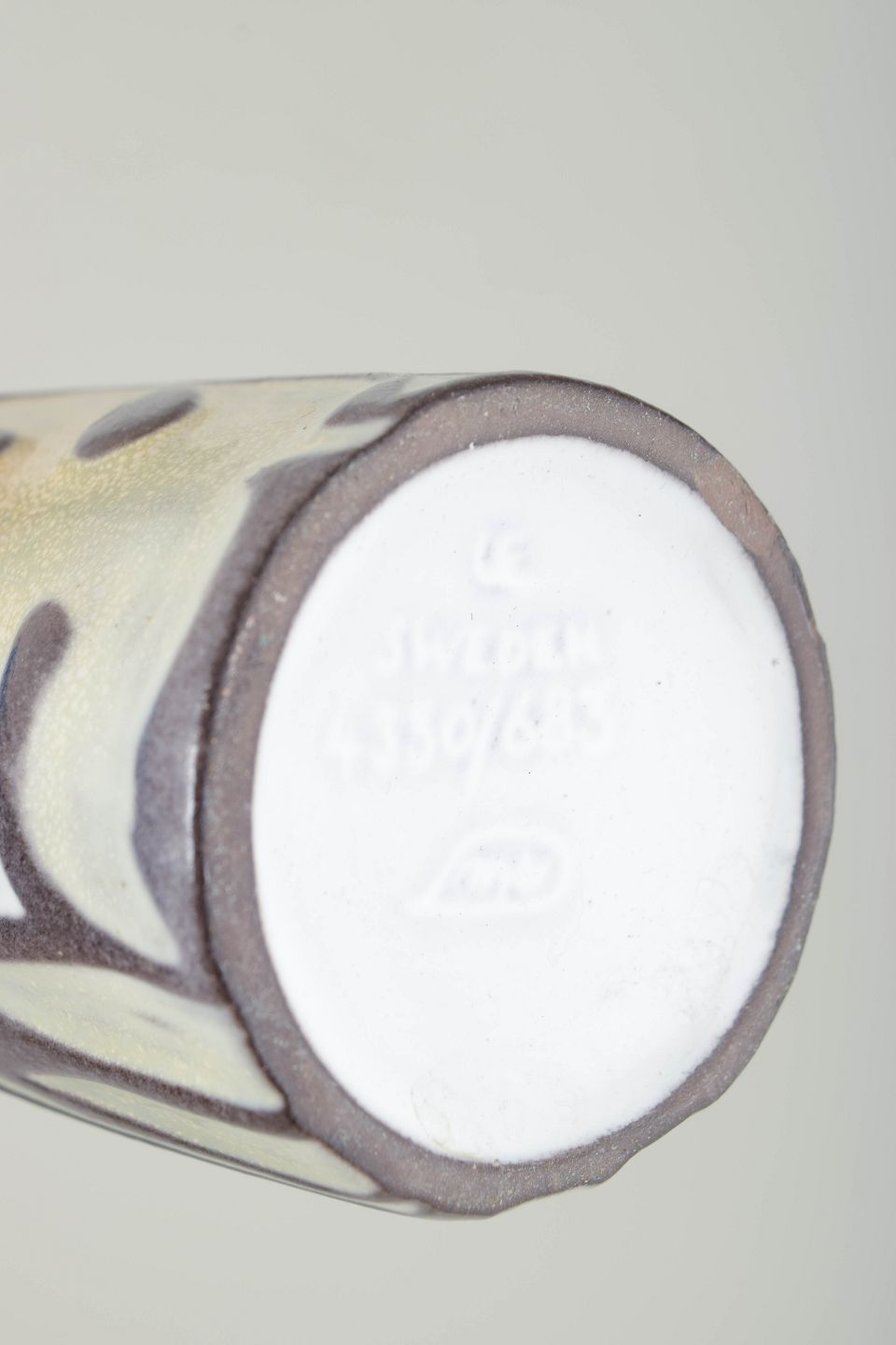 Cylinderformet vase i glaseret keramik med smal hals og grafisk dekoration i creme- og brunlige toner mod hvid bundglasur. Dekoren består af stiliserede bladmønstre og ornamentale elementer i et tydeligt modernistisk formsprog. Modelnummer 4330/683.
