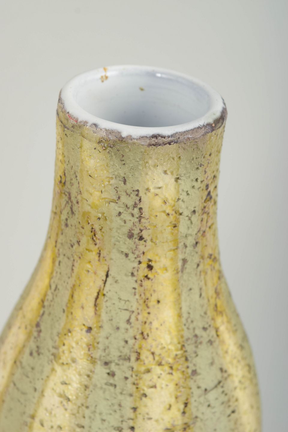 Organisk formet vase i glaseret keramik med smal hals og blødt buede sider. Dekoreret med lys gul glasur med mørke sprøjt og lodrette nuanceringer, der giver et levende, tekstureret udtryk. Modelnummer 4433.