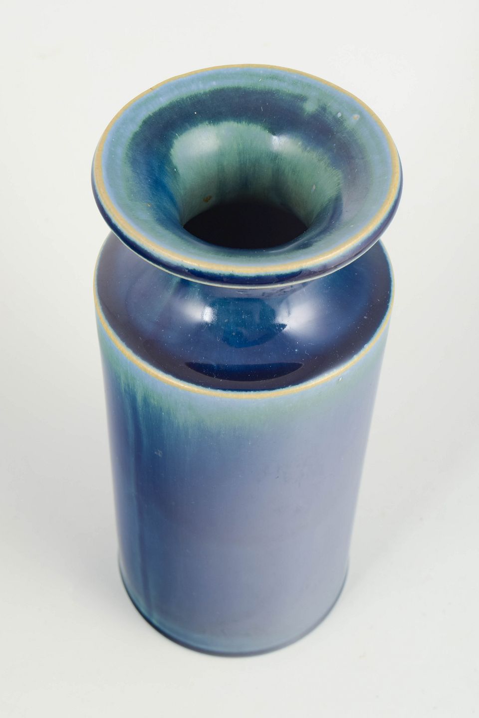 Cylinderformet vase i glaseret stentøj med dyb blå glasur og grønligt skær mod hals og kant; med Gustavsberg-mærke og etiket på undersiden.