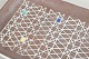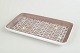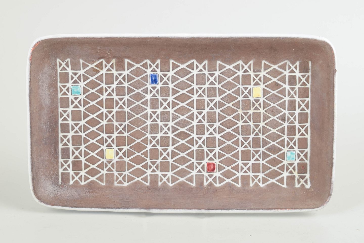 Rectangular stoneware dish with a brown glaze and a white geometric lattice pattern with small coloured accents; model 2146.