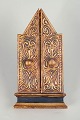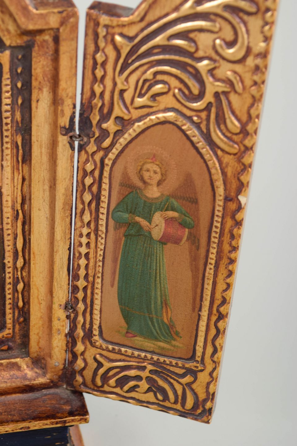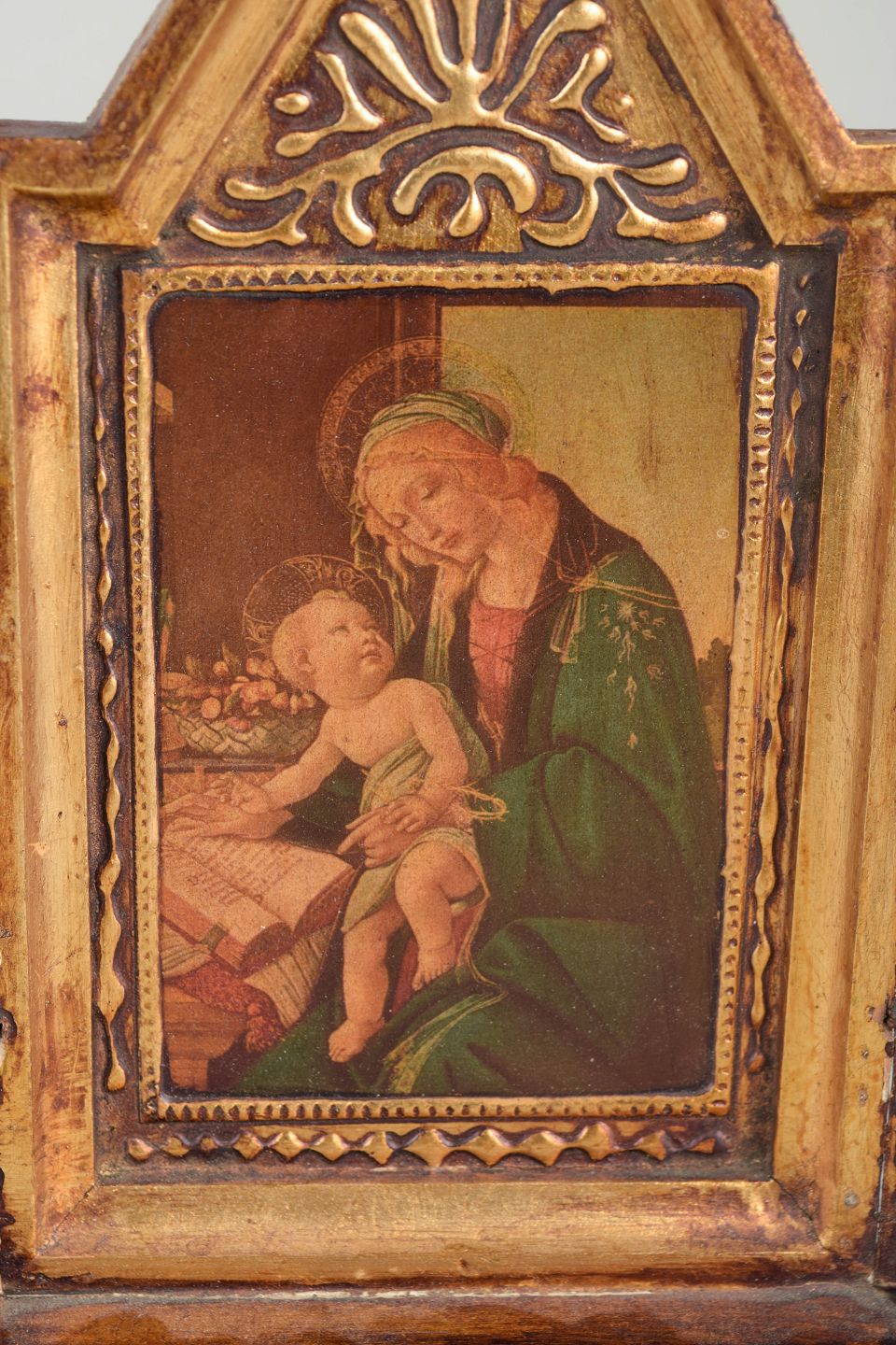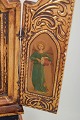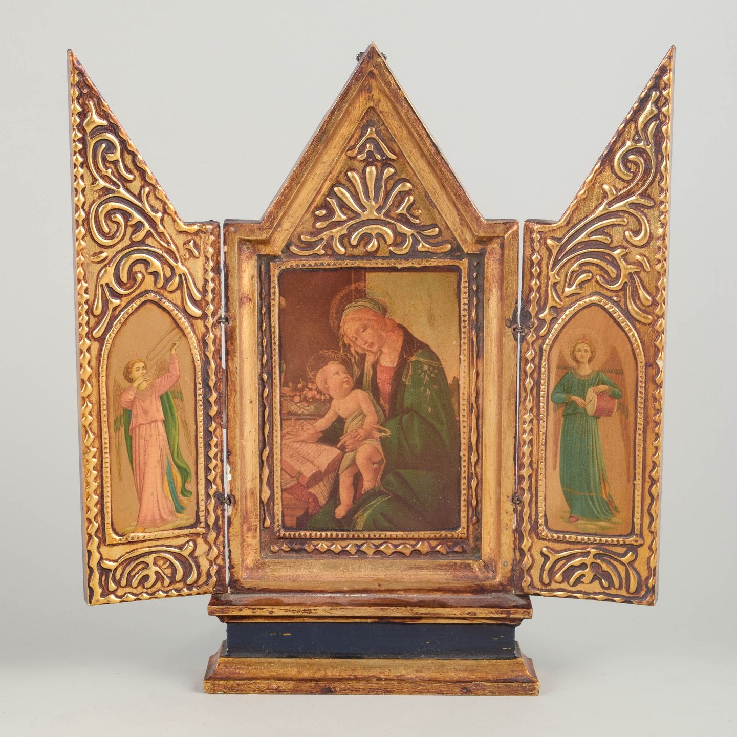 Folding triptych with a central icon of the Madonna and Child, flanked by saint figures on the wings. Painted on wood with a gilded, ornamented frame.
