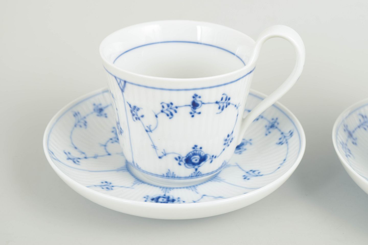 Two large mugs with matching saucers in hand-painted underglaze cobalt blue decoration in the classic Blue Fluted Plain pattern. Mug model 090 and saucer model 091. First quality.