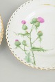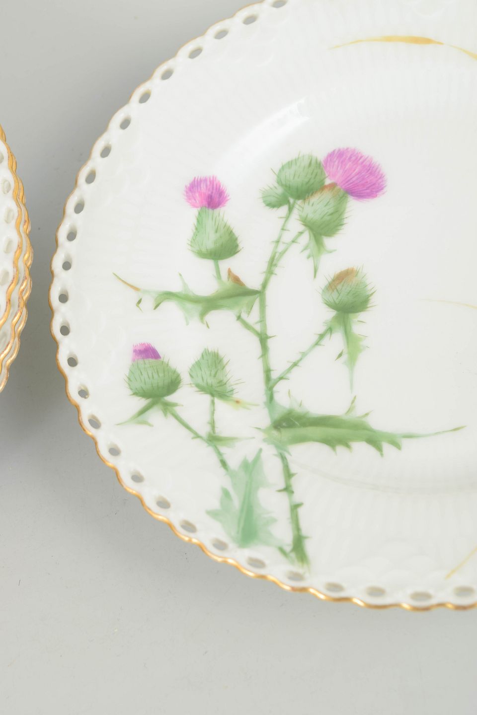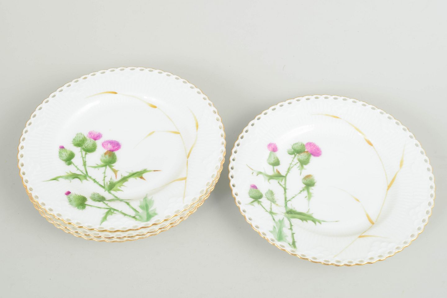 Hand-painted porcelain plates with an openwork rim and naturalistic decoration featuring a thistle motif. Executed with refined colour nuances and discreet gilding, characteristic of Royal Copenhagen’s 19th-century production.