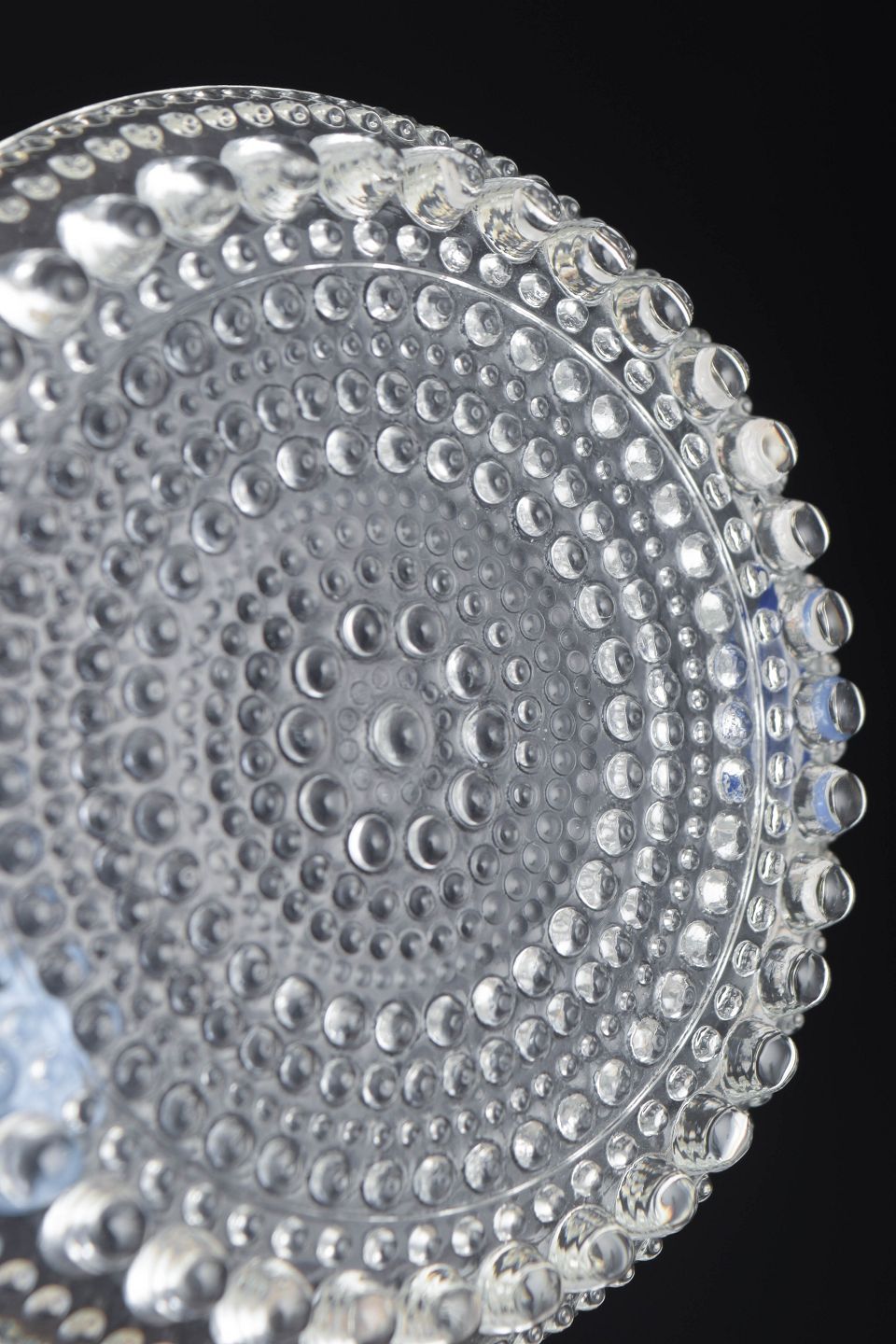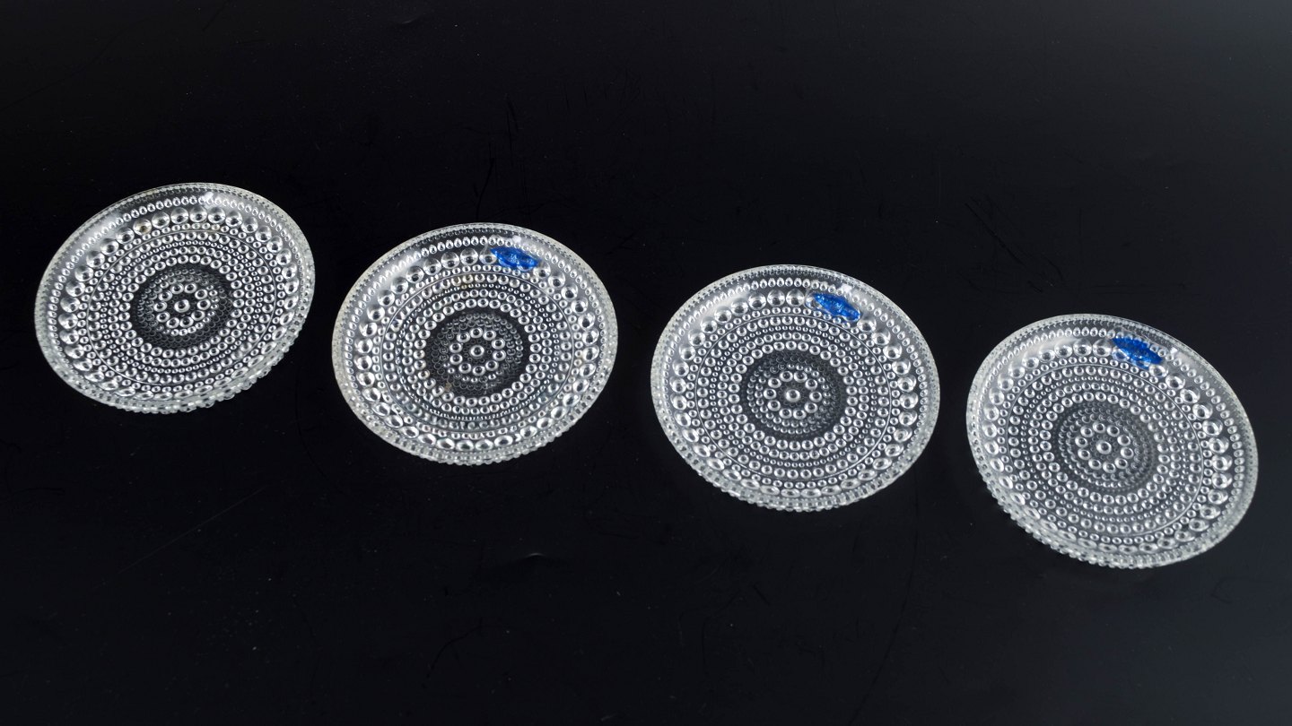 Sæt af fire små brikker i klart kunstglas med tæt relief af cirkulære knopmønstre. Fremstillet i presset glas.