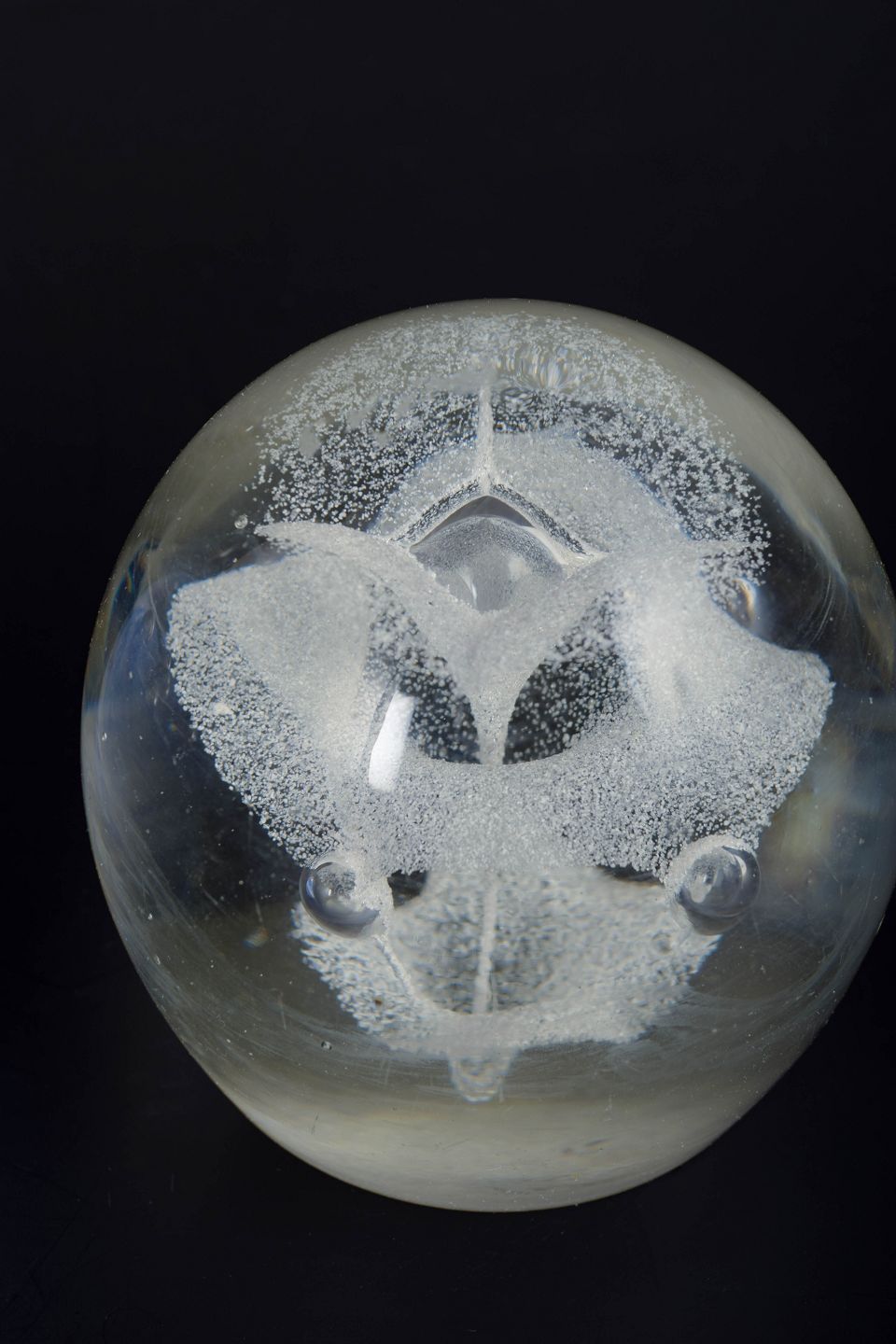 Organically shaped paperweight in clear art glass with internal blue and white veils and encapsulated air bubbles. Signed to the base “Studio Åhus, NK 1915–1990”.