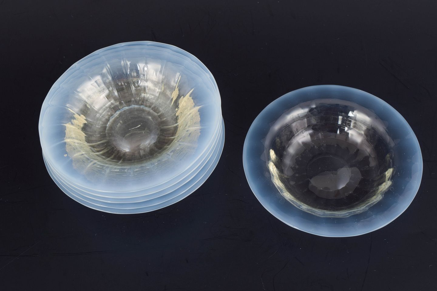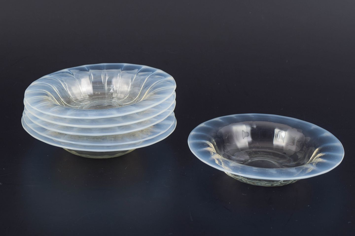 Six small art glass bowls produced in European studio glass with a clear, gently ribbed form and softly curved profile. The bowls display a harmonious organic silhouette and refined transparency.