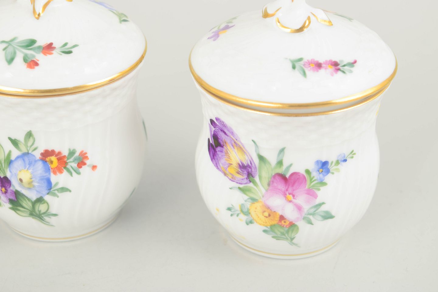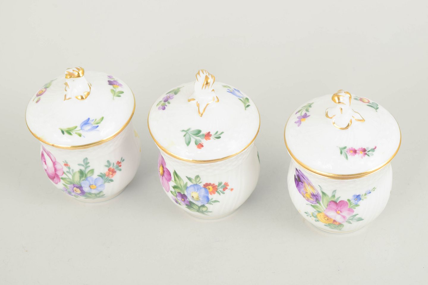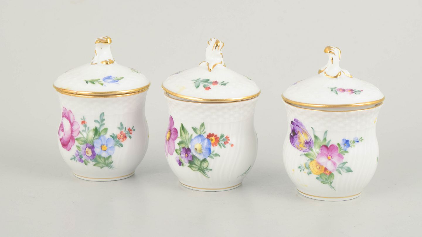 Royal Copenhagen, Saxon Flower set of three lidded cream cups.