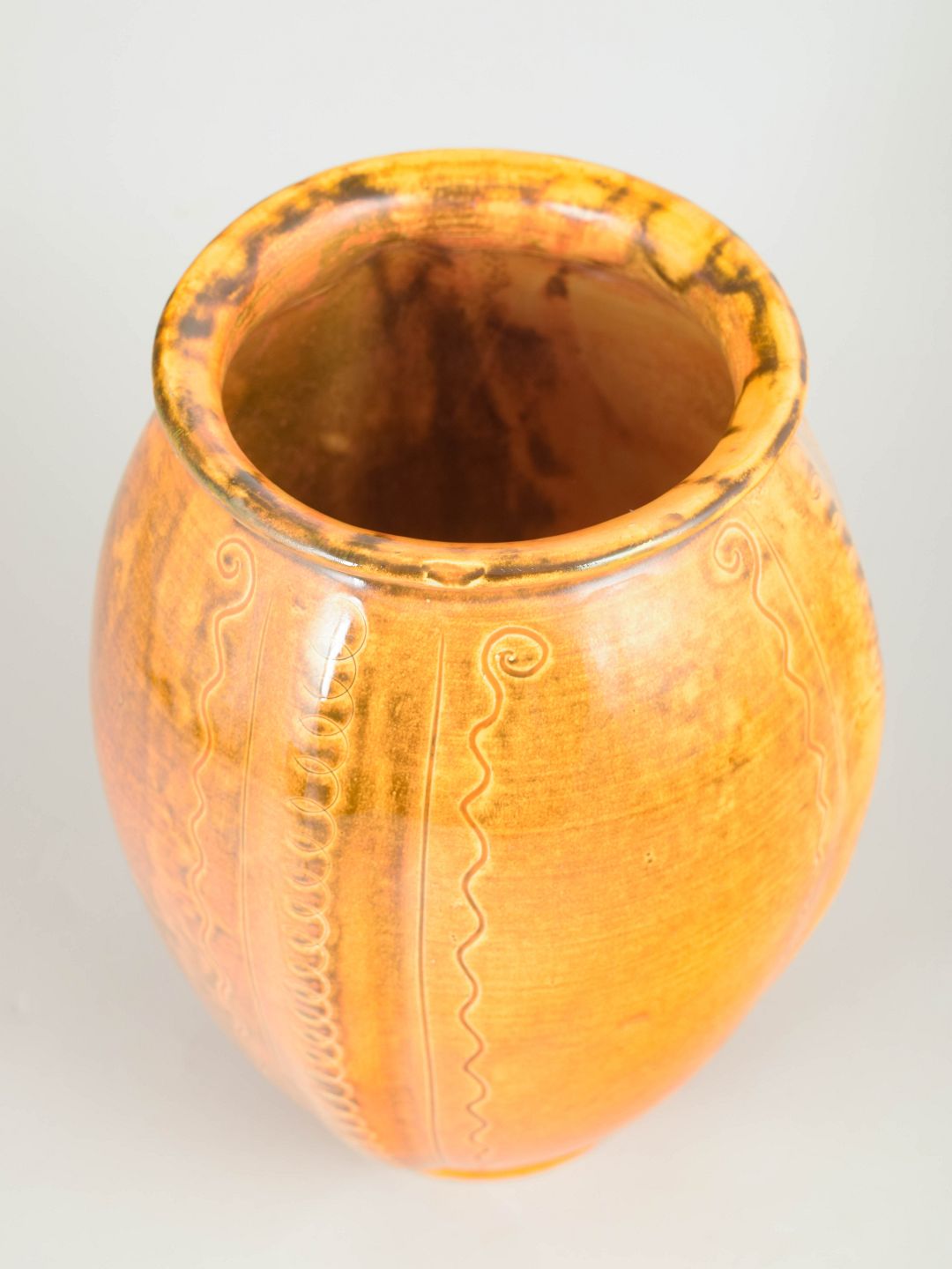 Large baluster-shaped vase in glazed earthenware with vertically arranged relief panels and undulating ornamentation. Executed in a light yellow glaze with warm orange tones and lively surface variation. Signed HAK to the base.