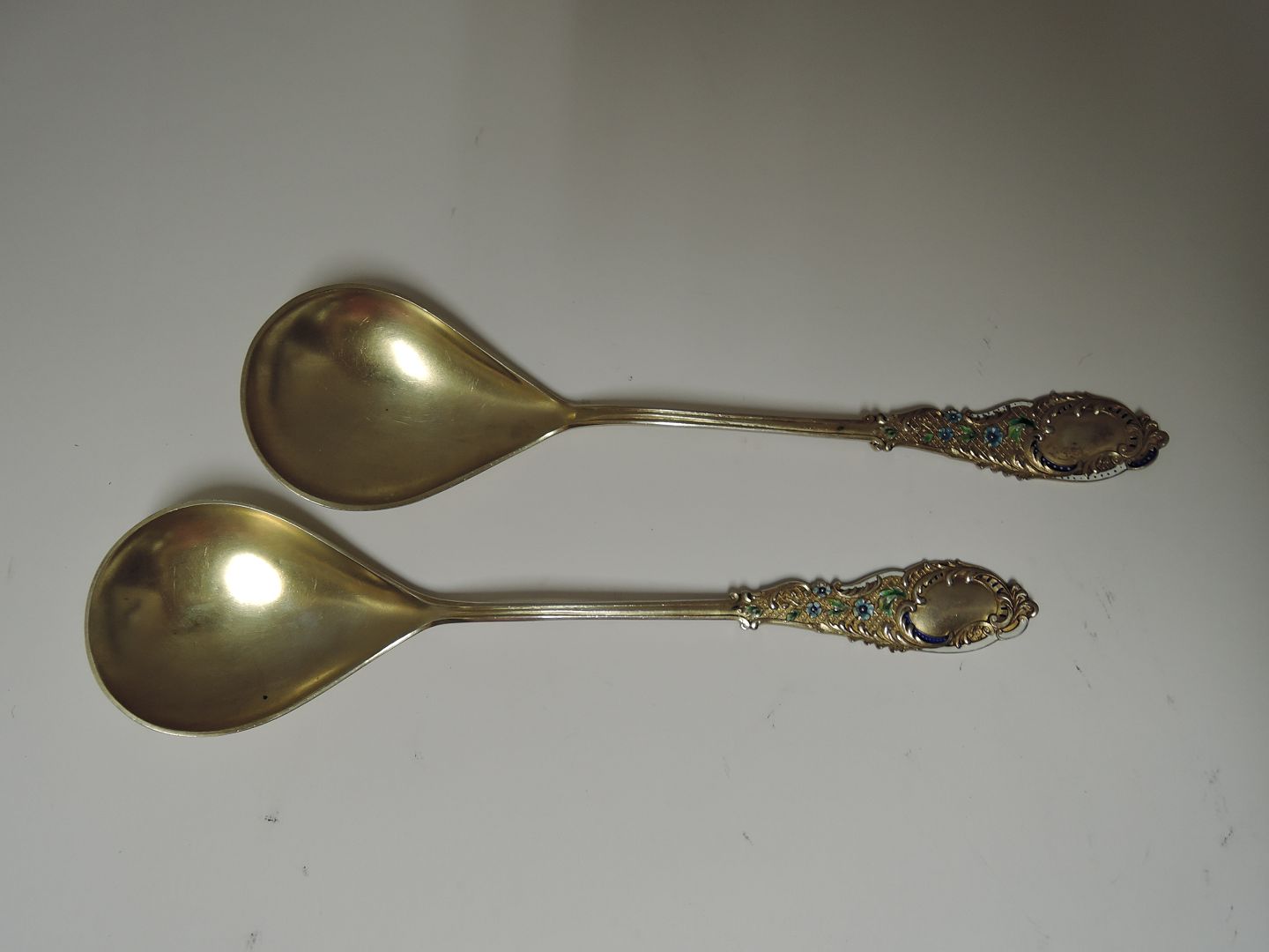 Marius Hammer. Sølv (900). Norske skeer med emalje. Et par. Længde 24,5 cm.