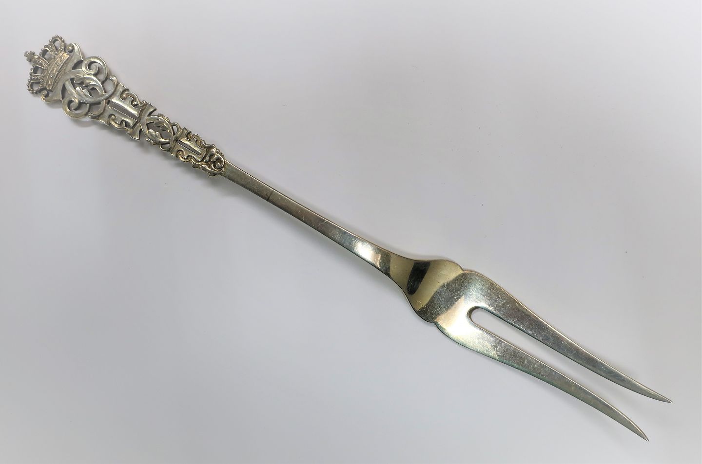 Michelsen. Four king spoon pattern. Meat fork. Length 25.5 cm. Produced 1900.