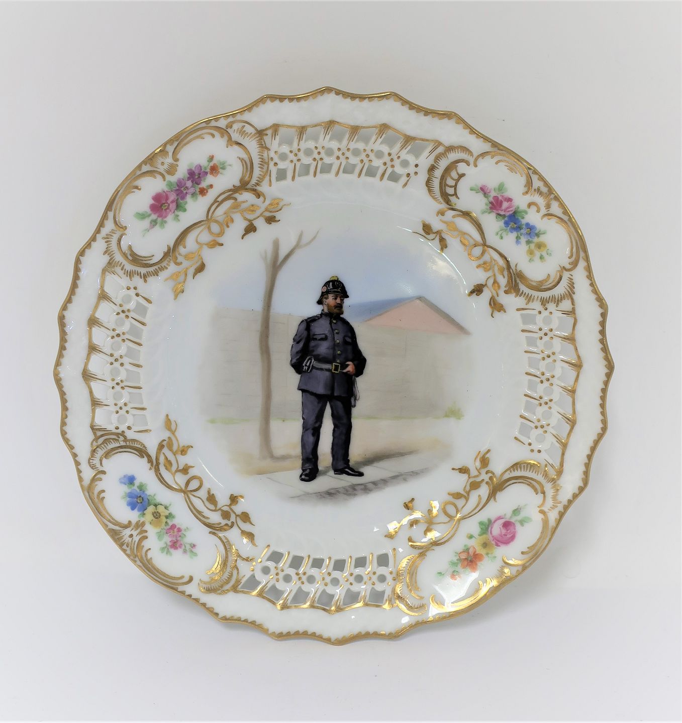 Royal Copenhagen. Plate with open-work border. Diameter 19 cm. Motiv; Fireman. Produced before 1923.