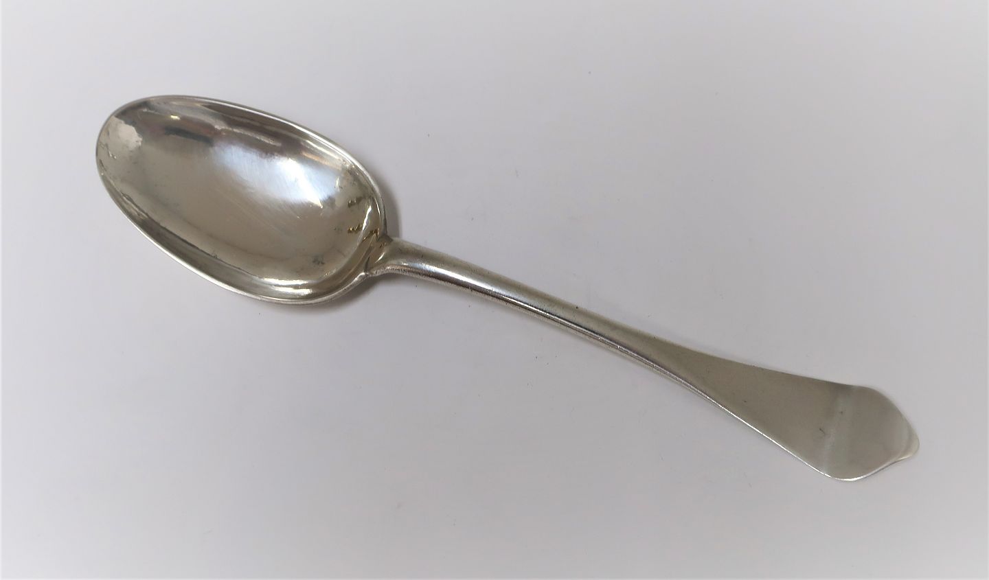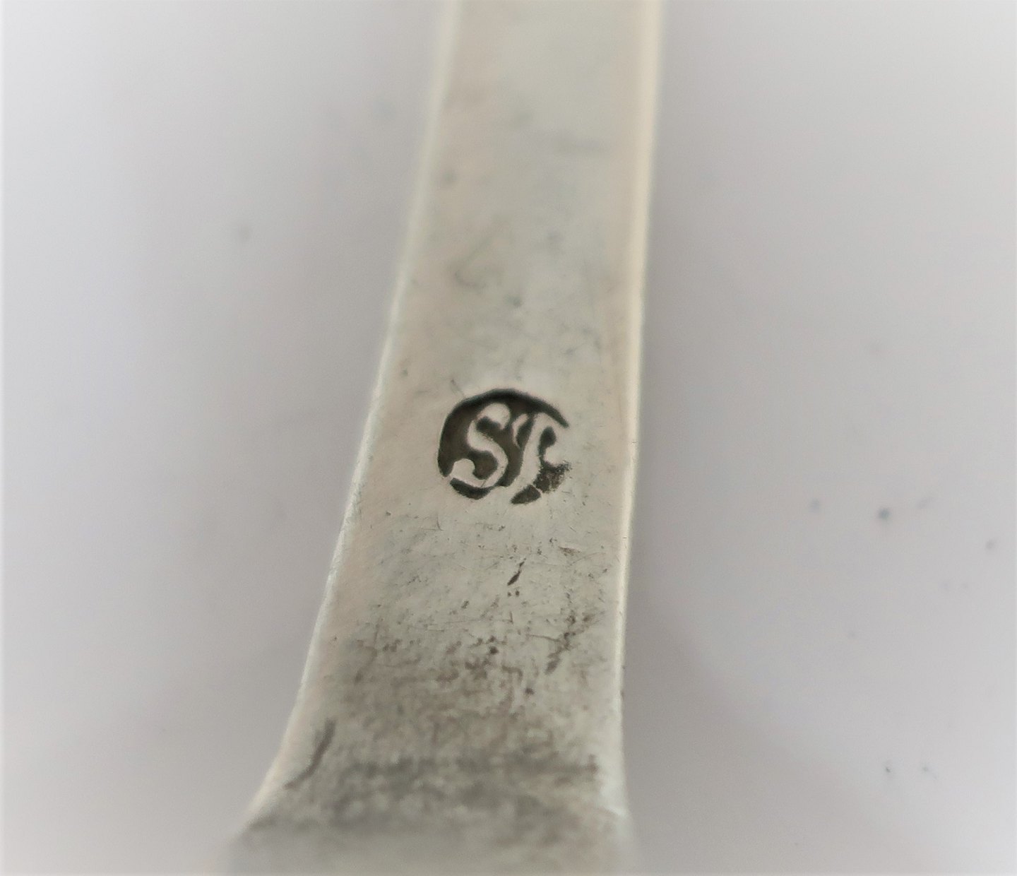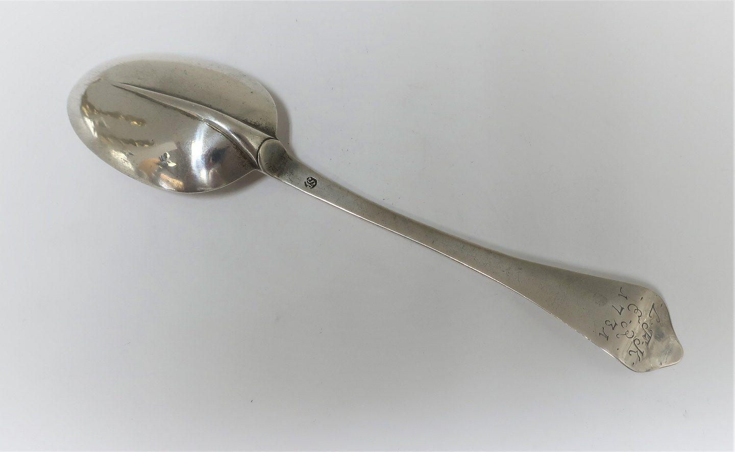 Søren Pedersen (1689-1744), Odense. Sølvske med rottehale. Mester stempel SP. Indgravering fra 1731. Længde 19,5 cm
