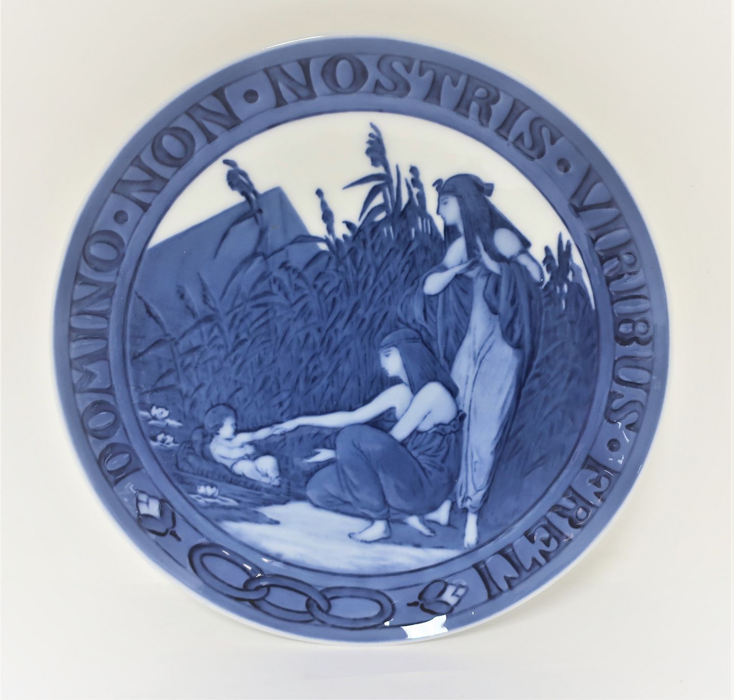 Royal Copenhagen. Mindeplatte #182. Odd Fellow platte. Moses bjerges på Nilen. Udført til fordel for Rebekkasøstrenes hittebørnshjem. 1918. Diameter 23 cm.