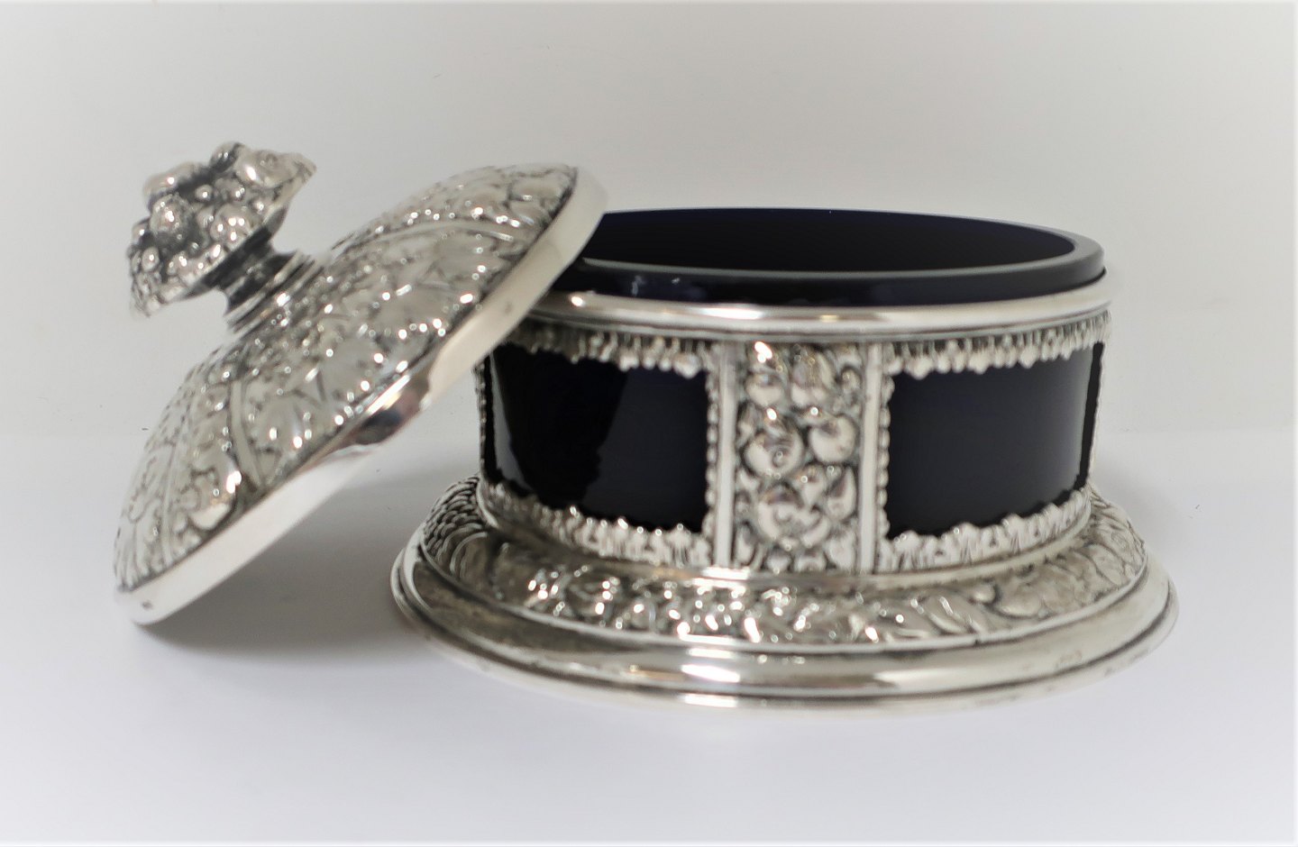 Sølvskål (830) med blå glasindsats. Diameter 10,5 cm.