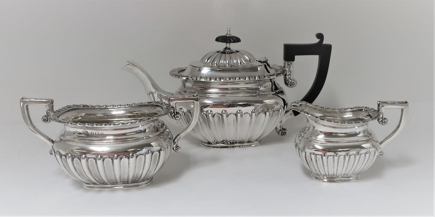 Engelsk teservice i sterling sølv (925). Bestående af tekande, flødekande og sukkerskål. Produceret Birmingham 1907.
