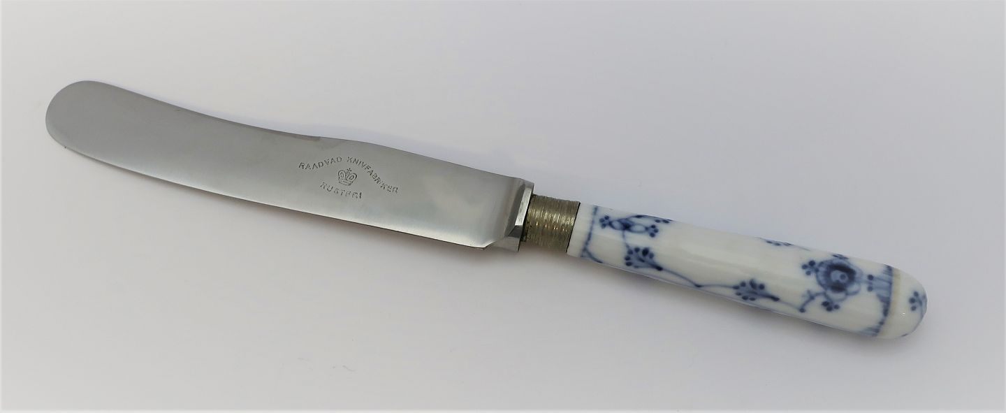 Royal Copenhagen. Musselmalet, riflet. Middagskniv. Rester af guld på skaft. Længde 23,7 cm.