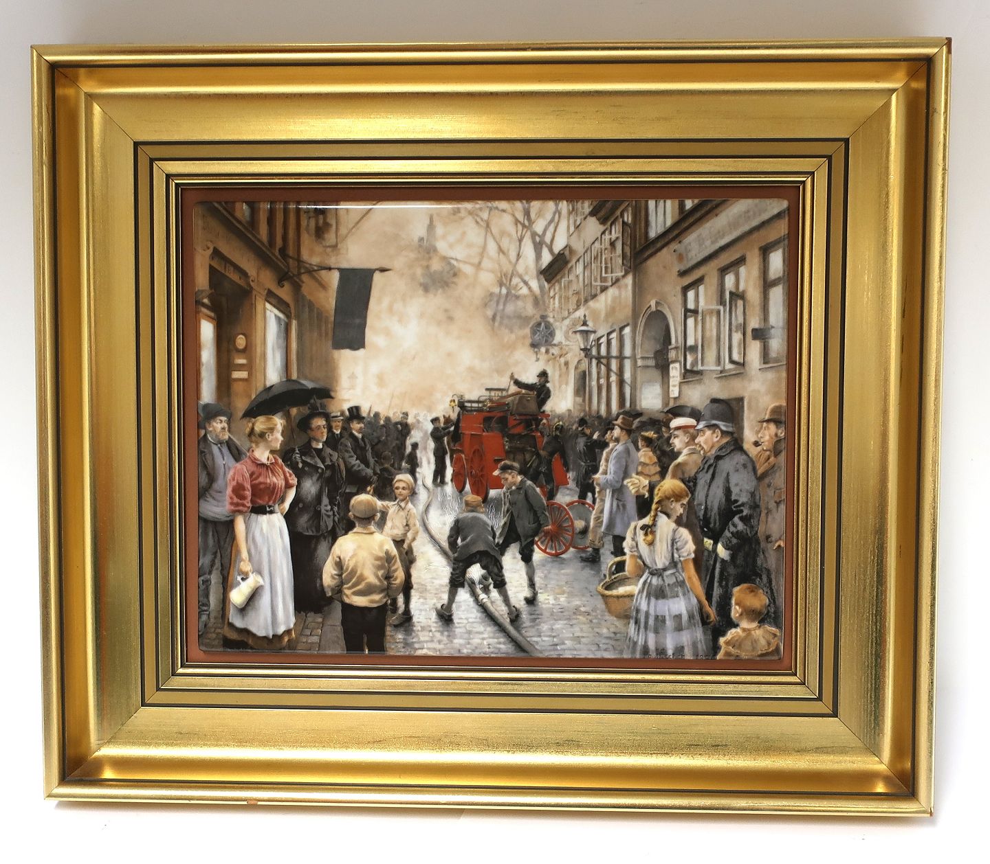 Bing & Grondahl. Porcelain painting. Motif by Paul Fischer. Fire in Skindergade. Size inclusive frame, 40 * 33 cm. Produced 1750 pieces. This has number 1538.