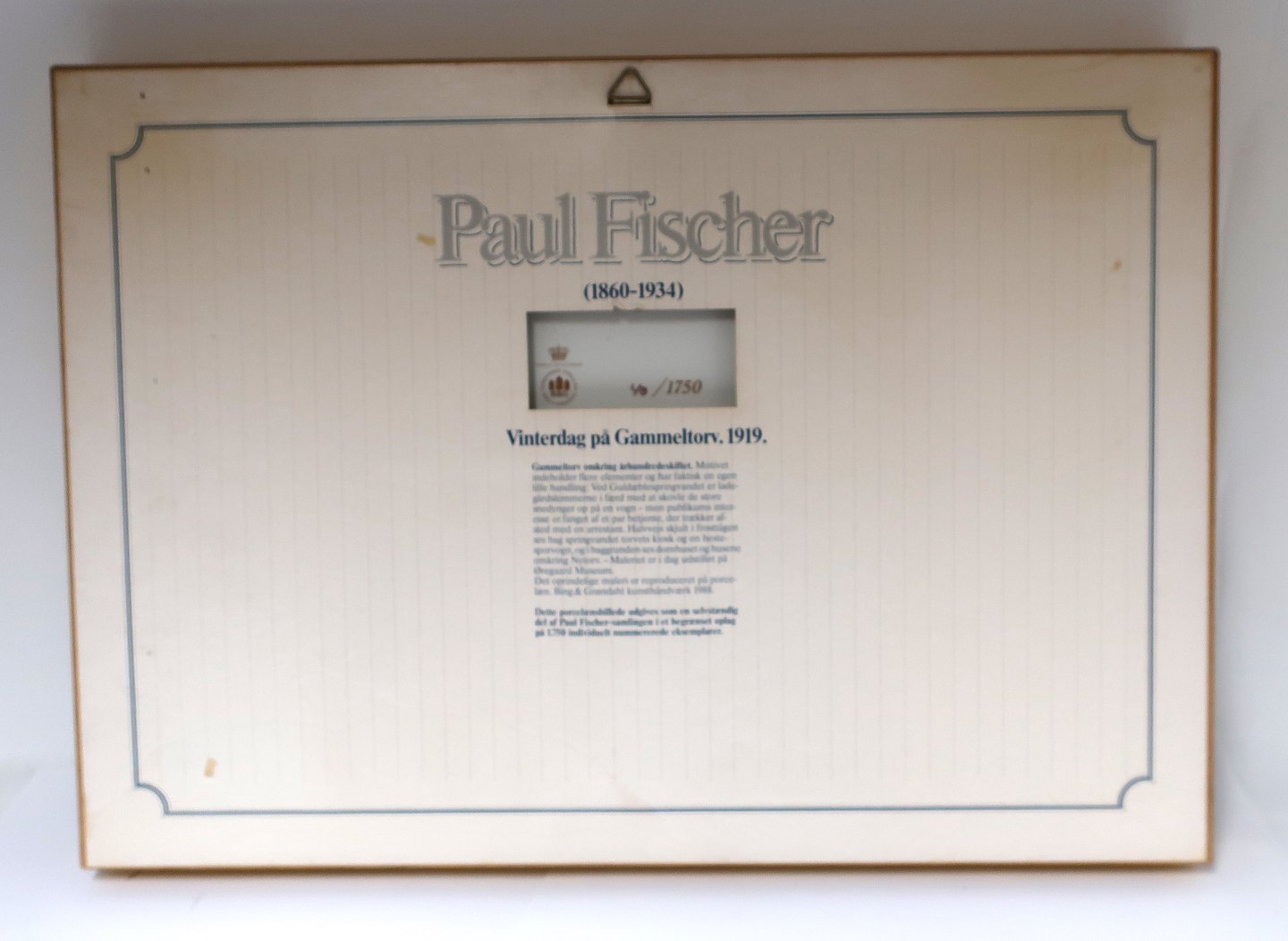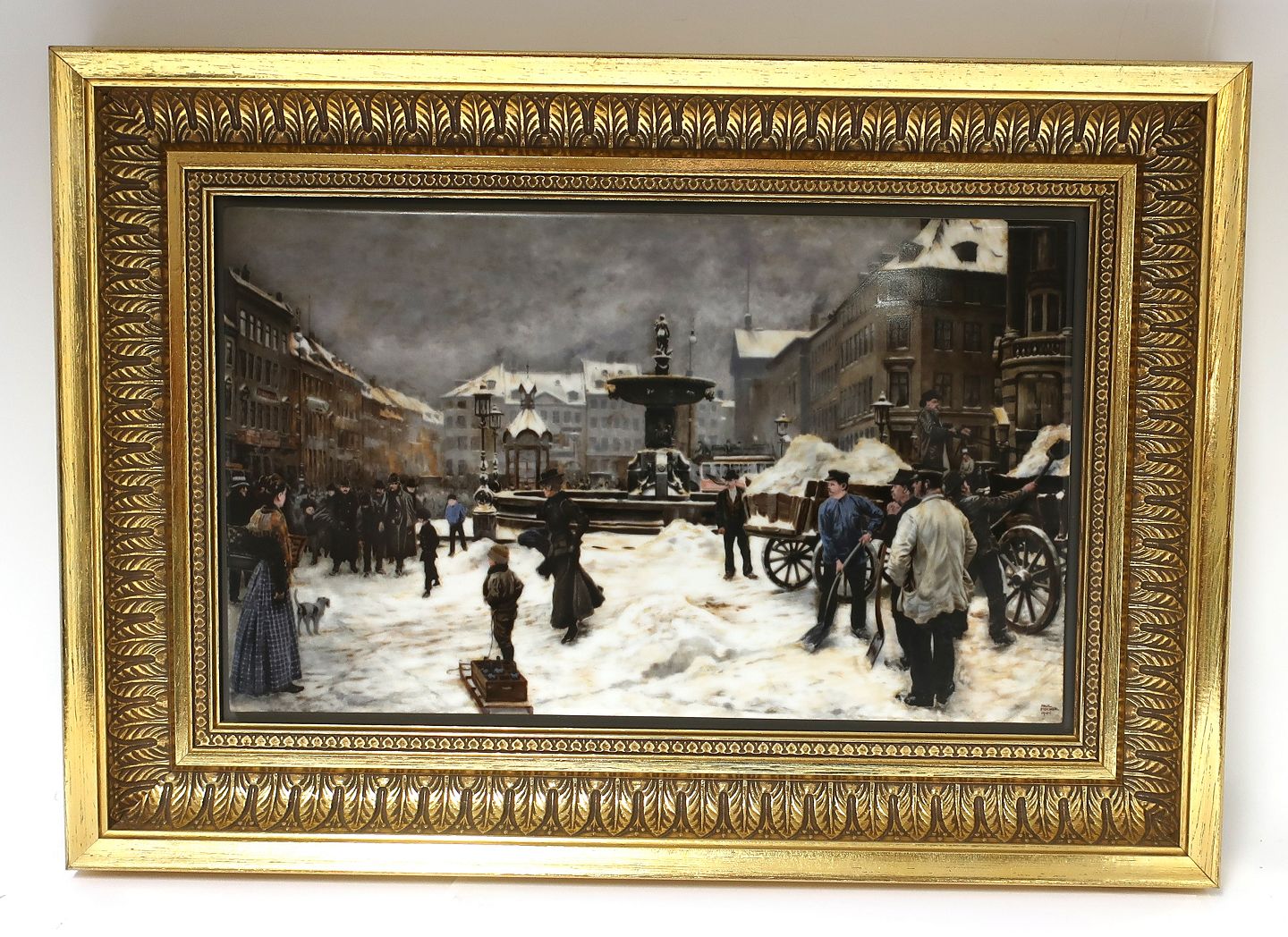 Bing & Grondahl. Porcelain painting. Motif by Paul Fischer. Winter day at Gammeltorv. Size inclusive frame, 47 * 33 cm. Produced 1750 pieces. This has number 40