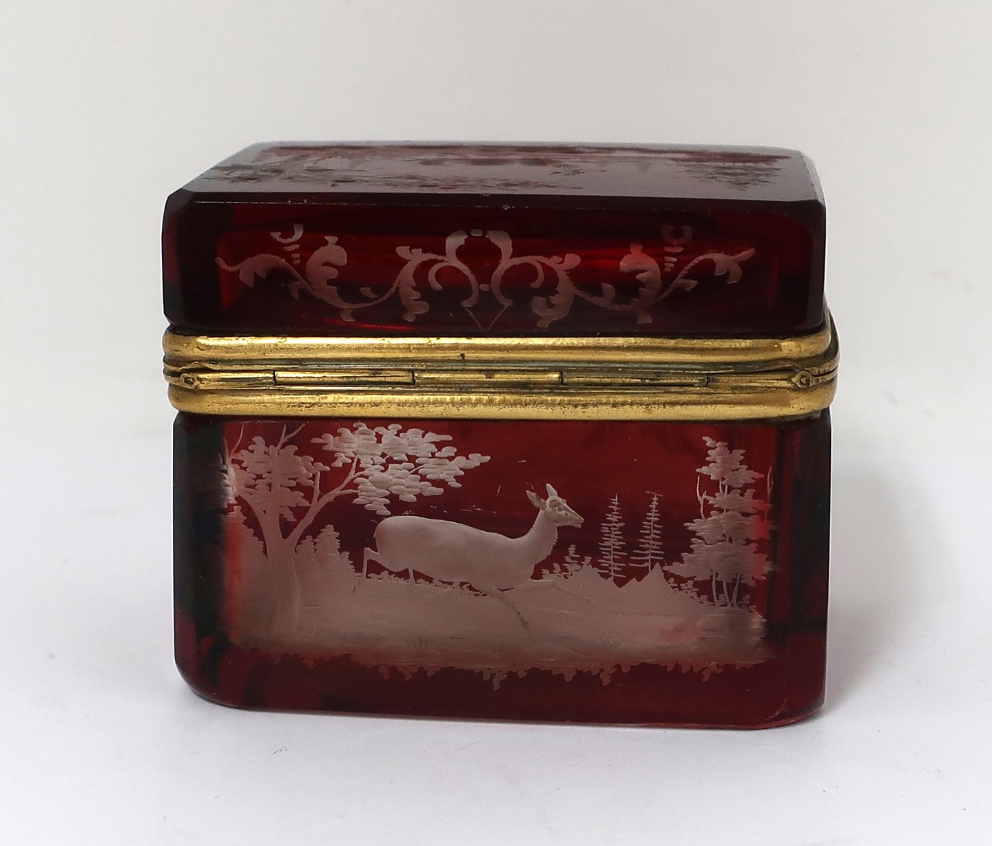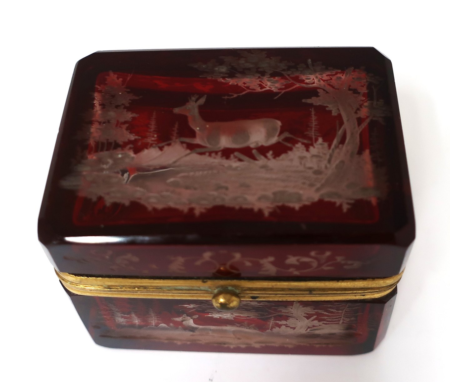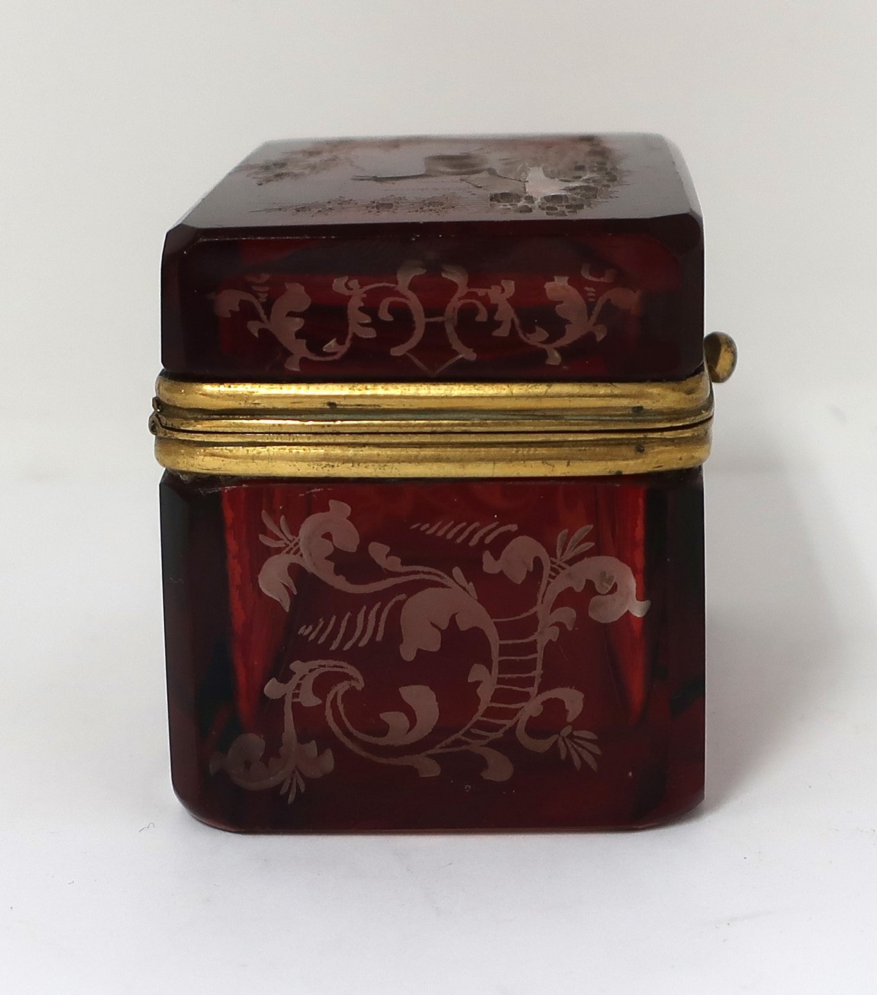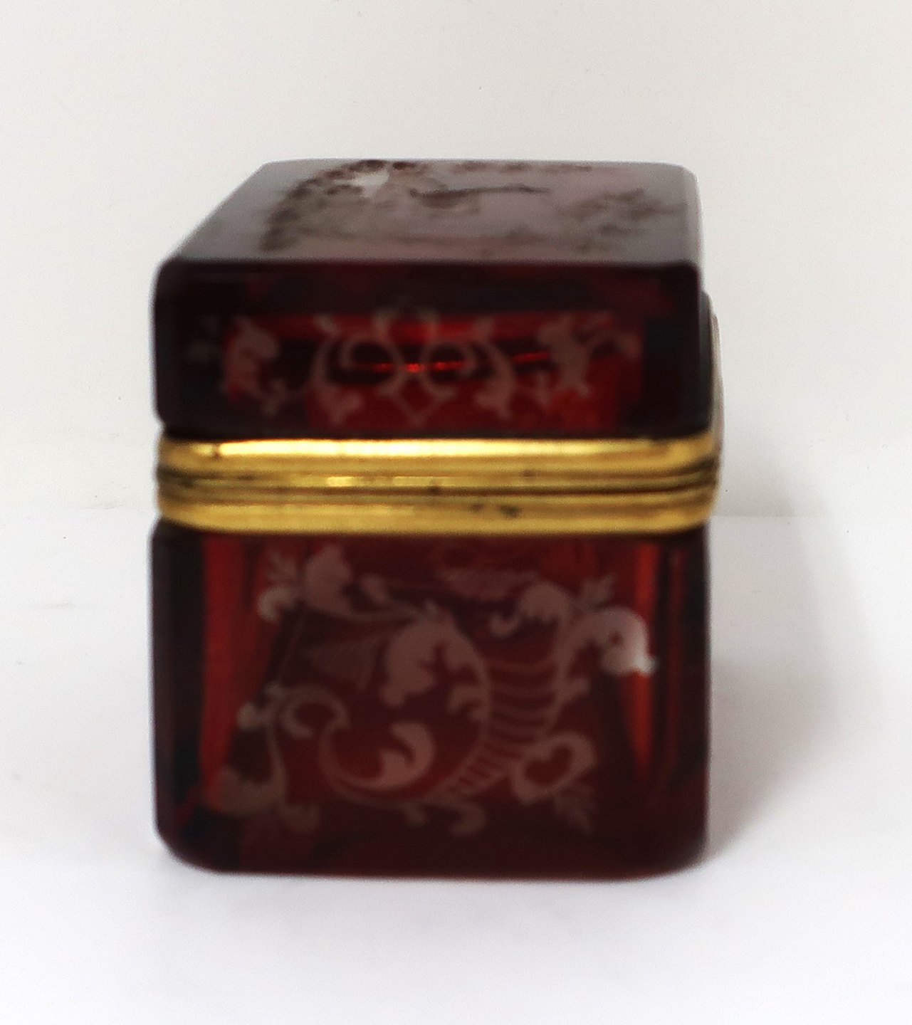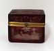 Small sugar box. Red glass. Height 6 cm. Width 5 cm. Length 7.2 cm.