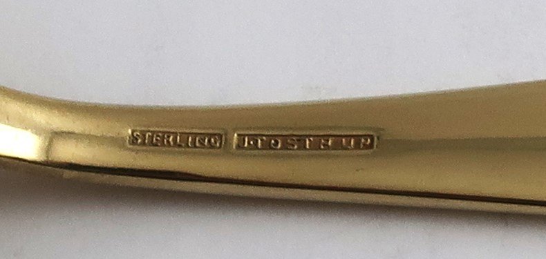 J. Tostrup, Norge. Sterling barnegaffel forgyldt med hvid emalje. Længde 15,3 cm.