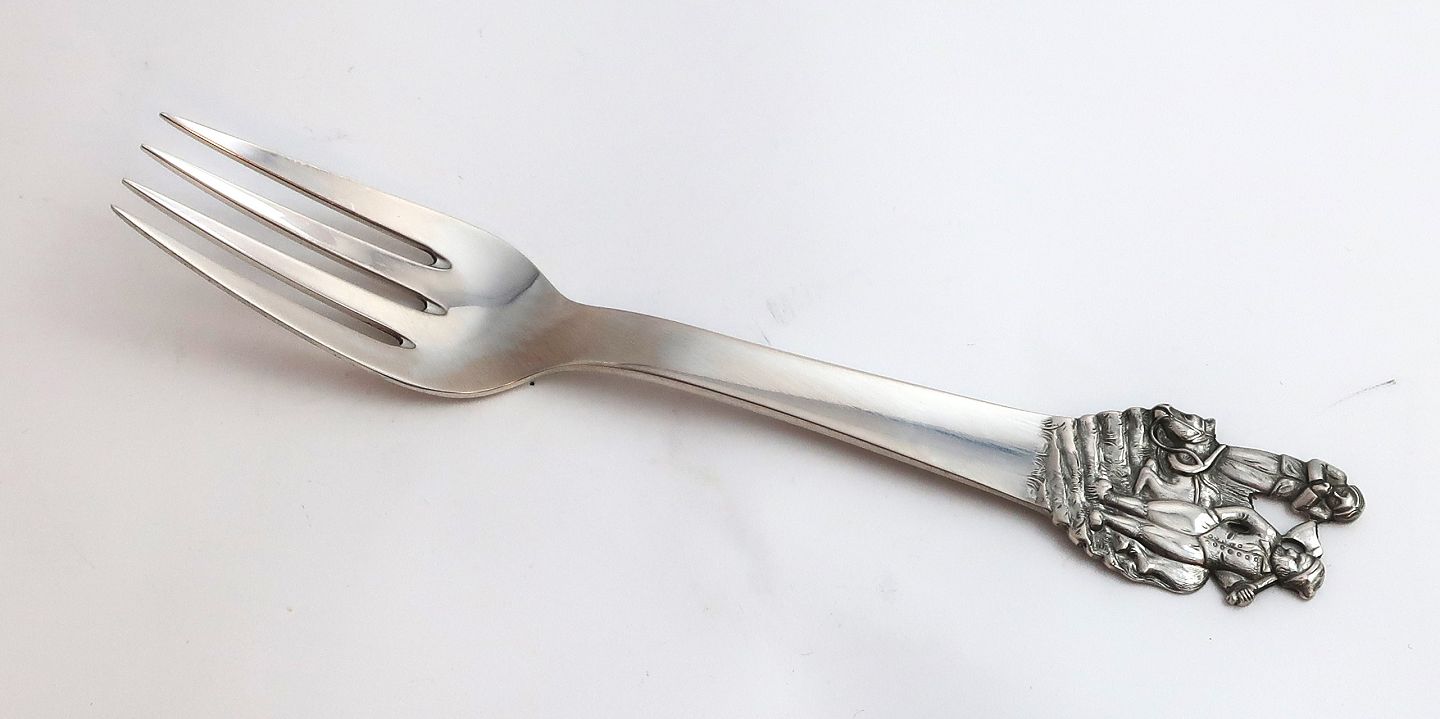 H. C. Andersen eventyrgaffel. Sølvbestik. Lille Claus og store Claus. Sølv (830). Længde 15 cm