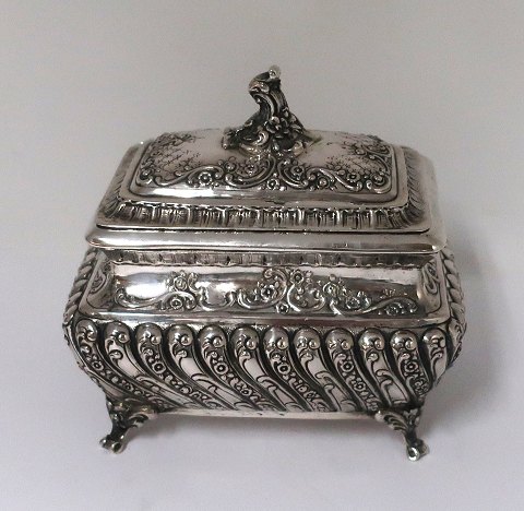 Danish work. Silver bonbonniere on foot with 6 amethysts and amber ball (830). Height 19 cm. Produced 1919.