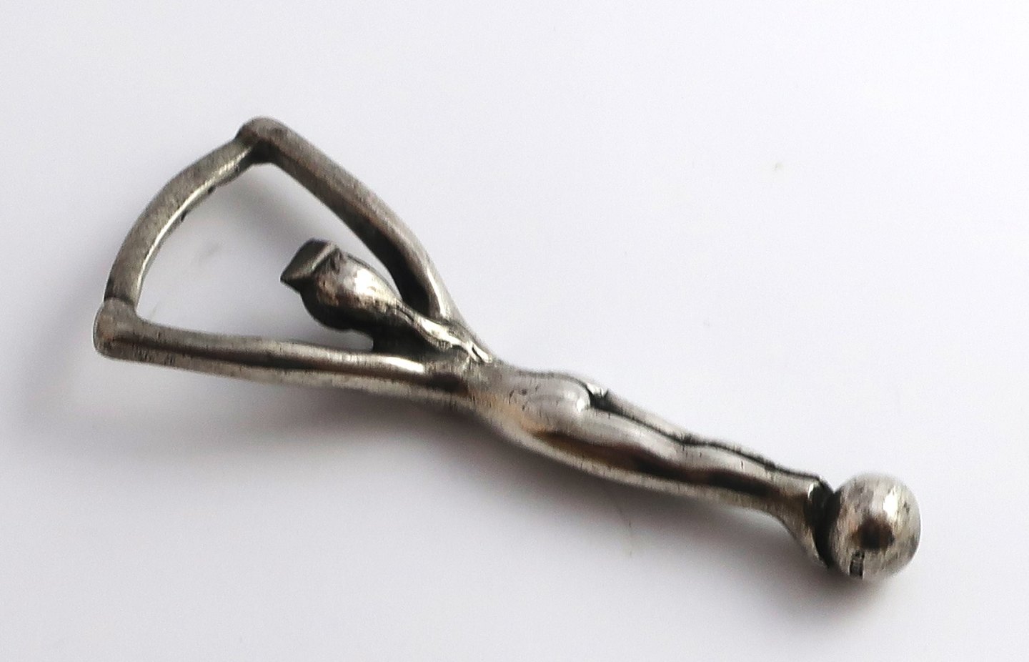 Silver capsule opener in the shape of a woman (830). Length 10 cm.