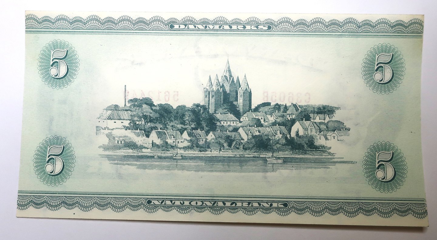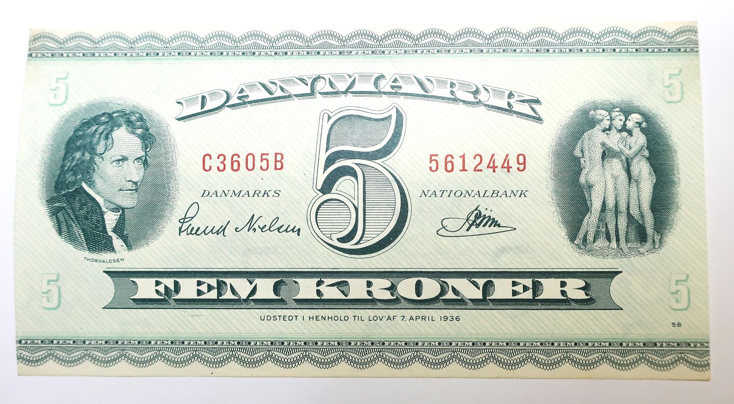 Danmark. Pengeseddel 5 kr. 1954 A3. Kvalitet 0-01
