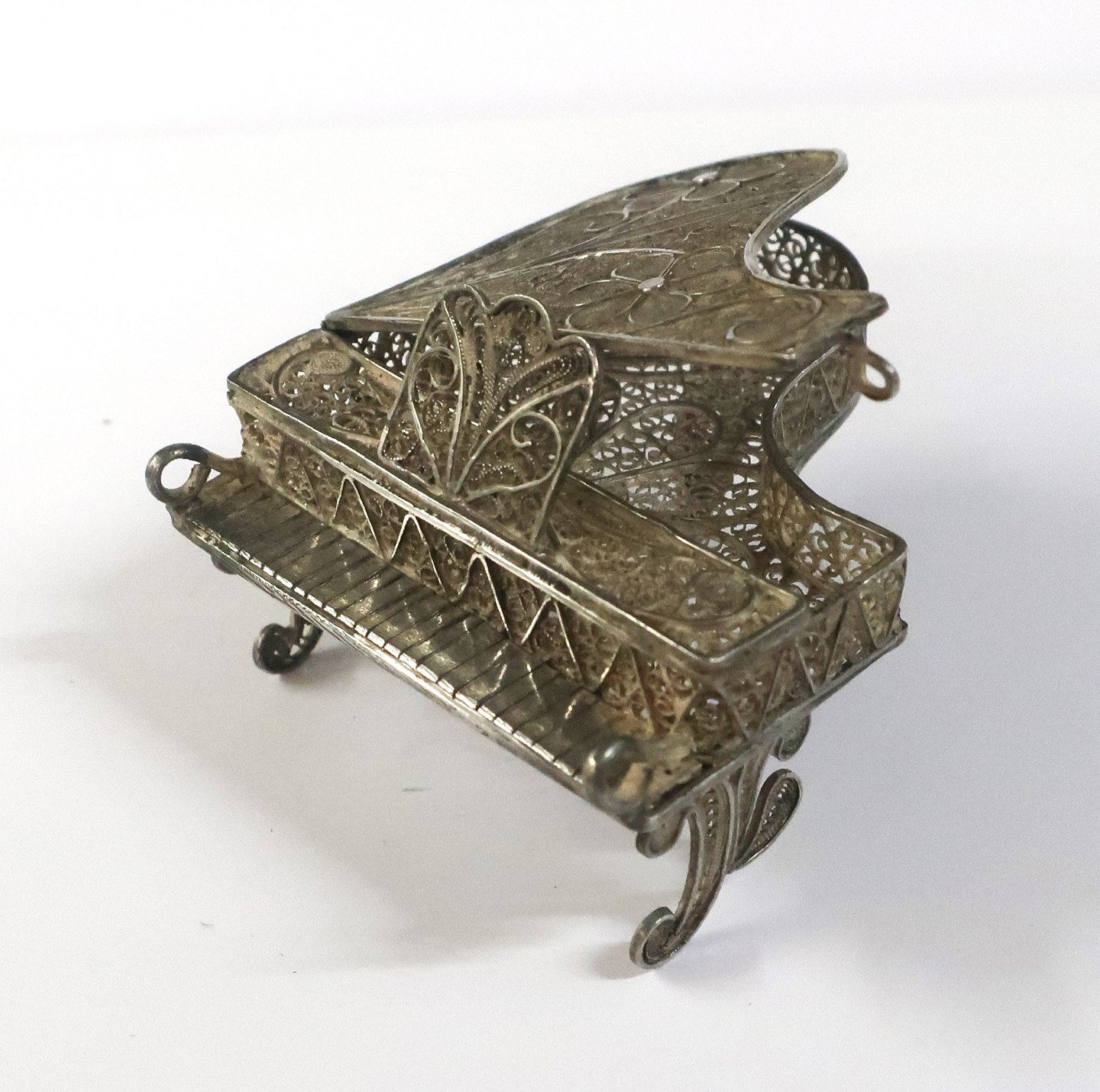 Small miniature grand piano in filigree silver (800). Length 6.6 cm. Height 3.3 cm