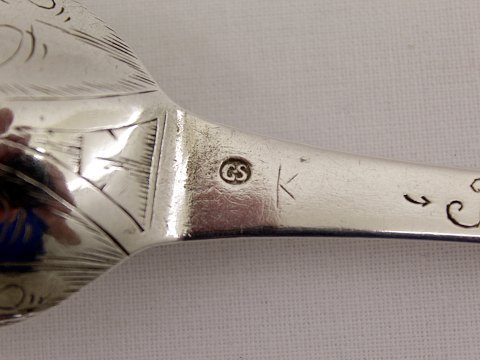 Silversmith Christian Wilhelm Schlegel Fredericia two spoons engraved "Three Brothers 1744" and "Three Sisters 1744" L. 19.5 cm. No. 274936