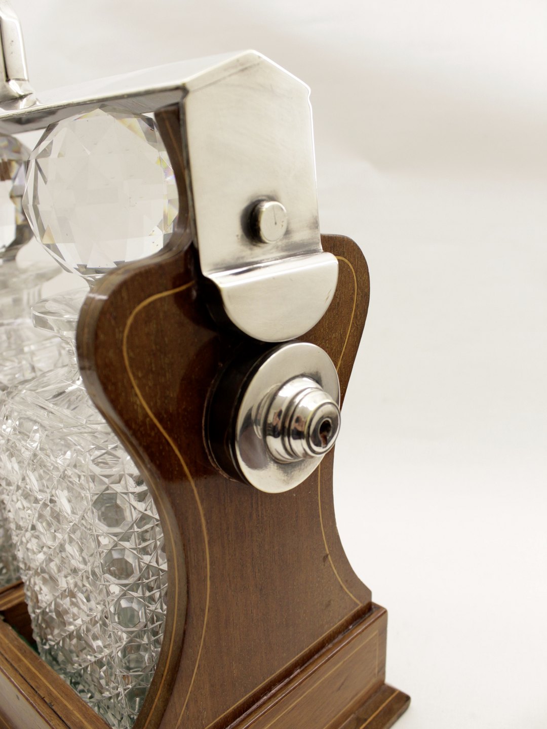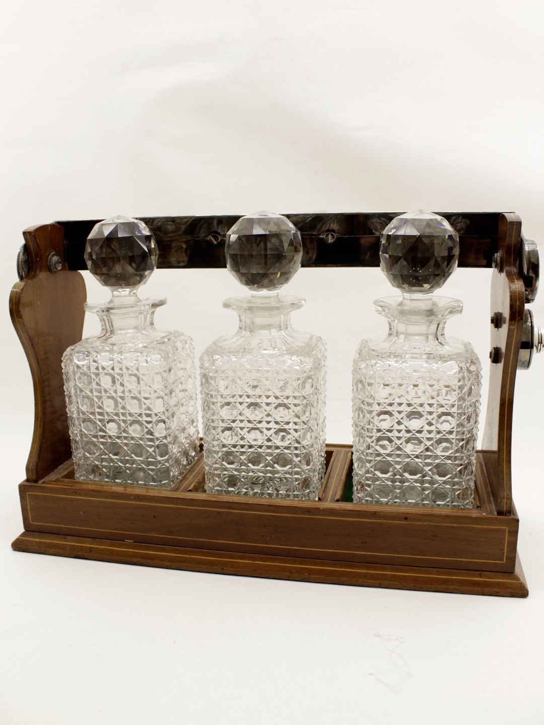 English 1800 Century tantalus with 3 carafes in polished box small chips in the bottom of decanters No. 288204