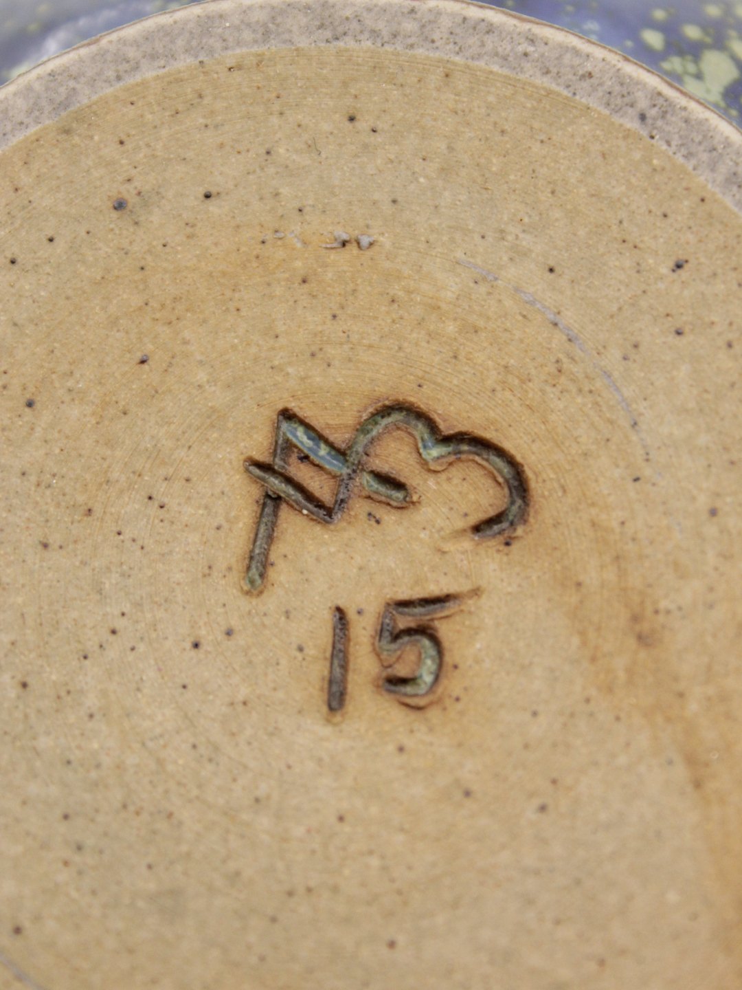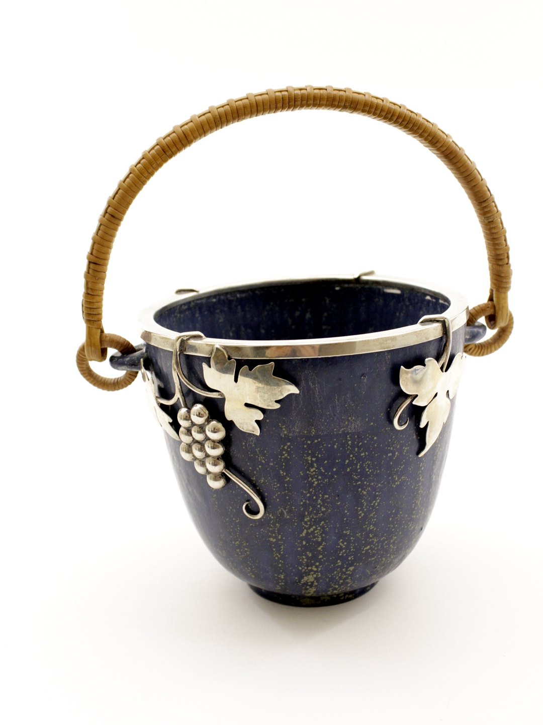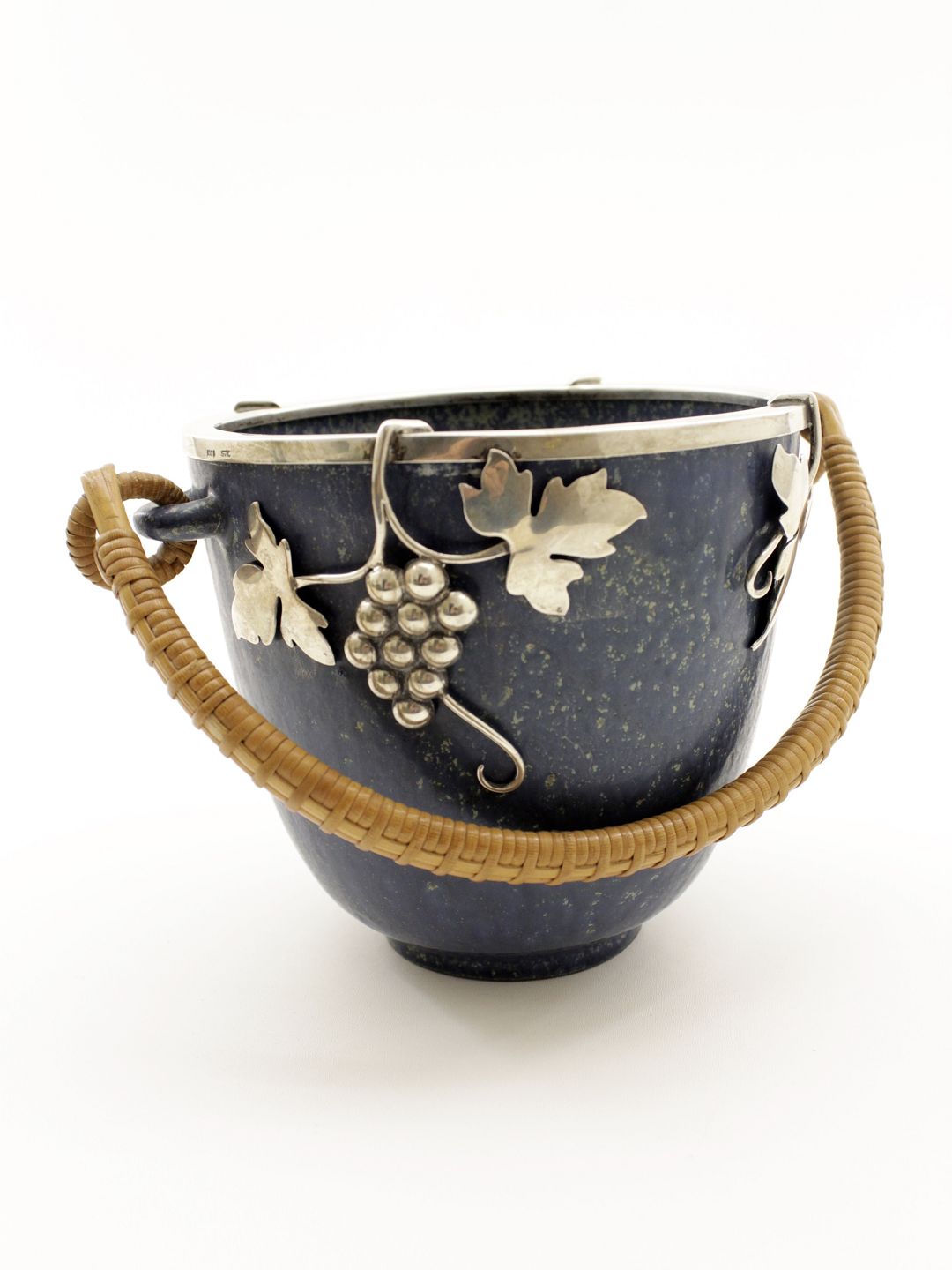 Arne Bang 1901-1983 Isspand af stentøj sign. monogram AB 15 H. 13 cm. D.14,5 cm.med sølvmontering i form af drueklase og vinløv fra sølvsmed Sv. Toxværd Nr. 316044