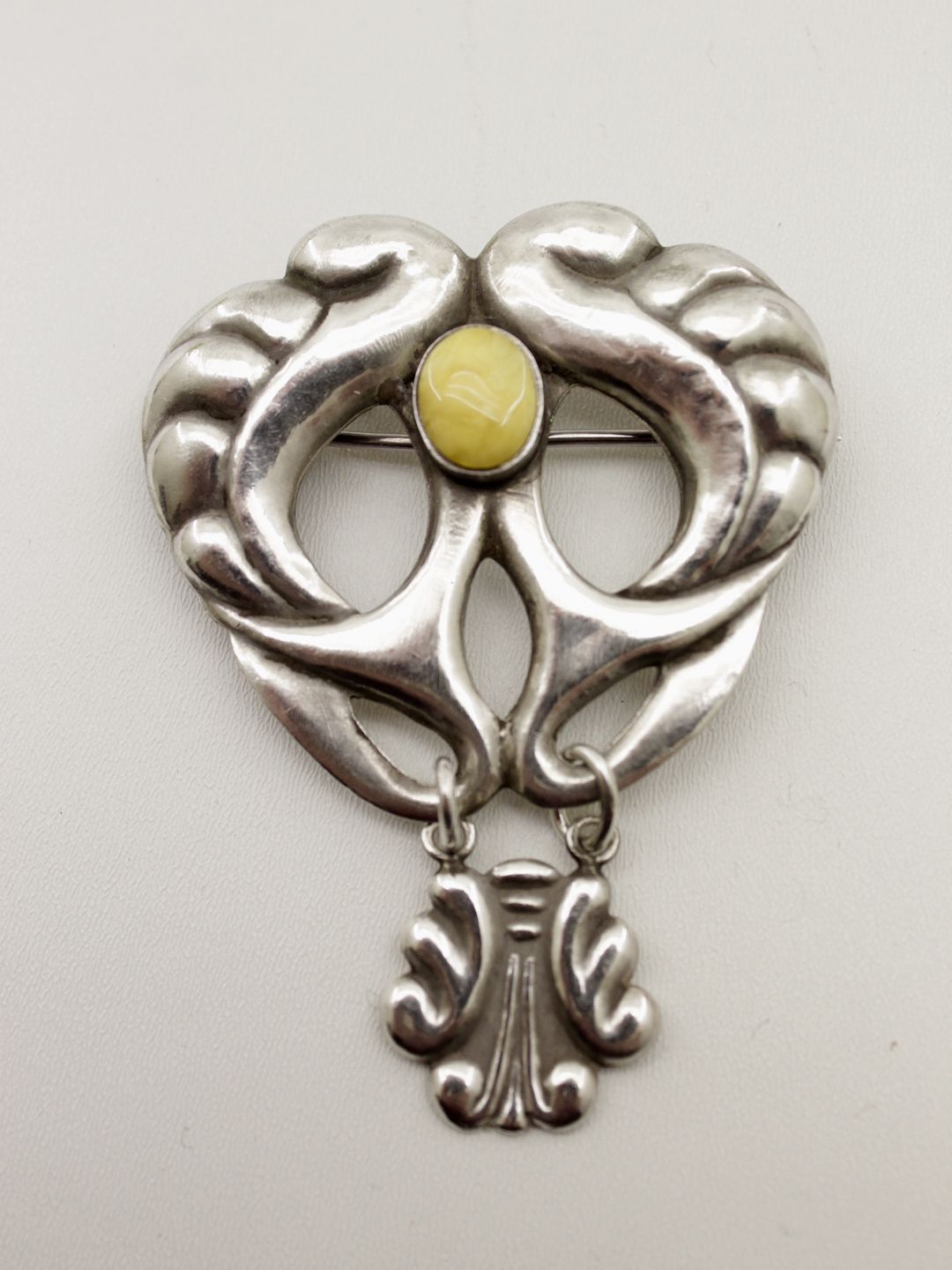 Skønvirke sterling sølv broche 7 x 5 cm. med rav
