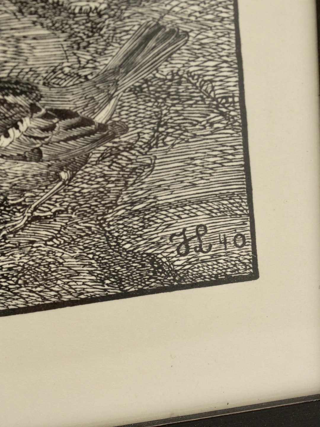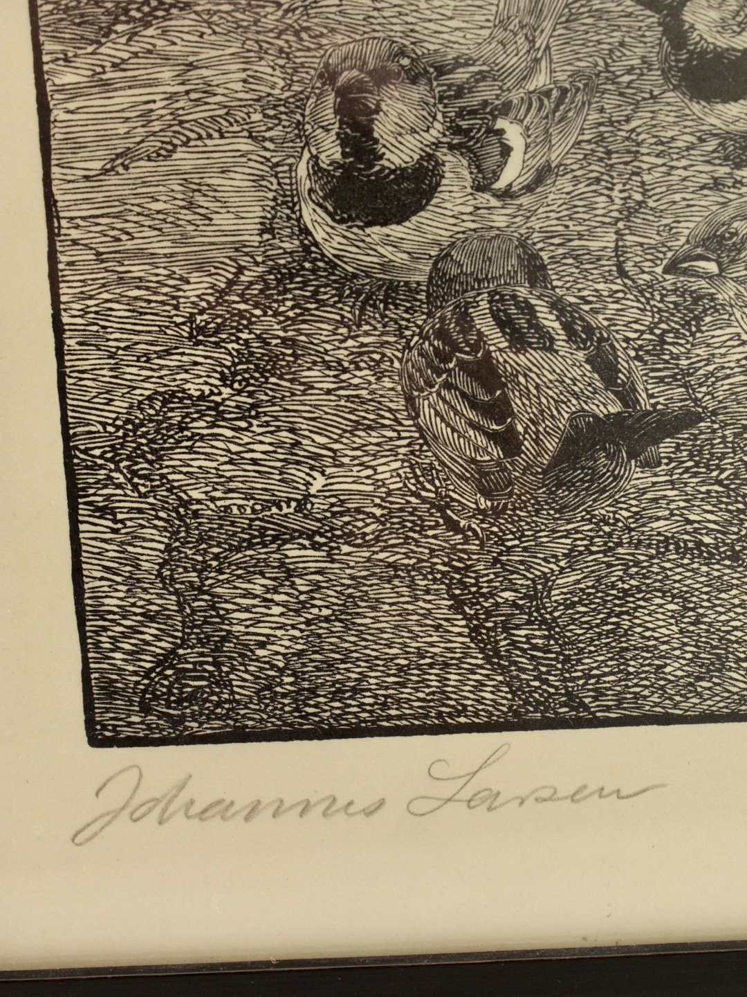 Johannes Larsen træsnit 30 x 33 cm. gråspurve signeret Johannes Larsen Nr. 372803