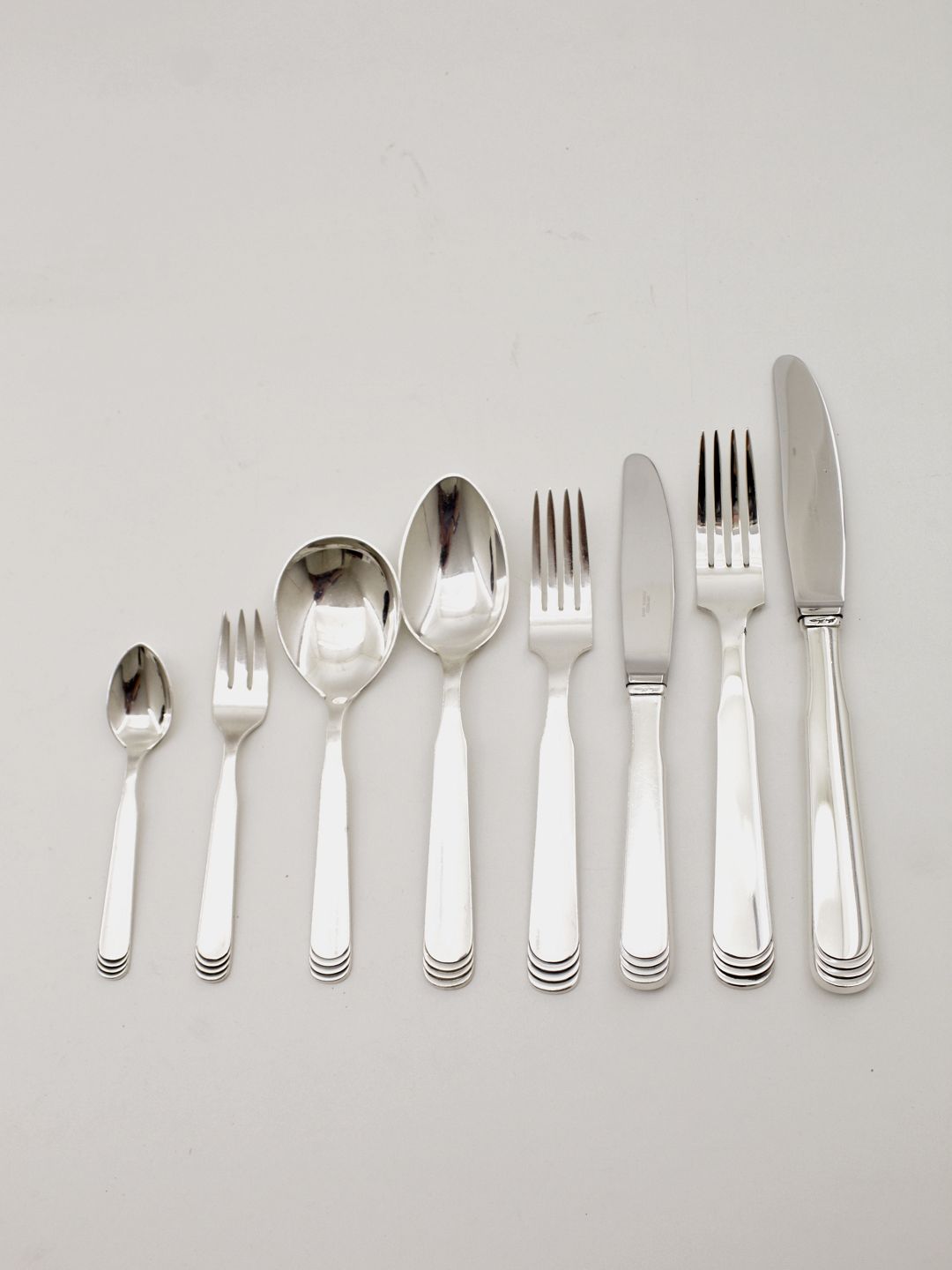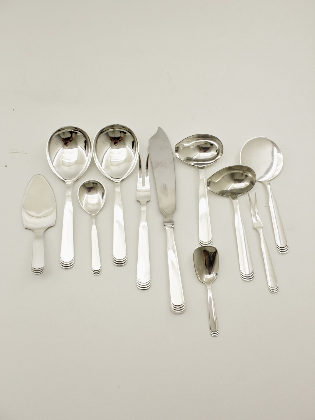 Hans Hansen silver no. 15 sterling silver art deco cutlery 12 dinner knives 12 forks 12 lunch knives 12 forks 12 spoons 12 bouillon spoons 12 cake forks 12 coffee spoons 12 pcs. serving parts (108) all in nice condition. No. 374567