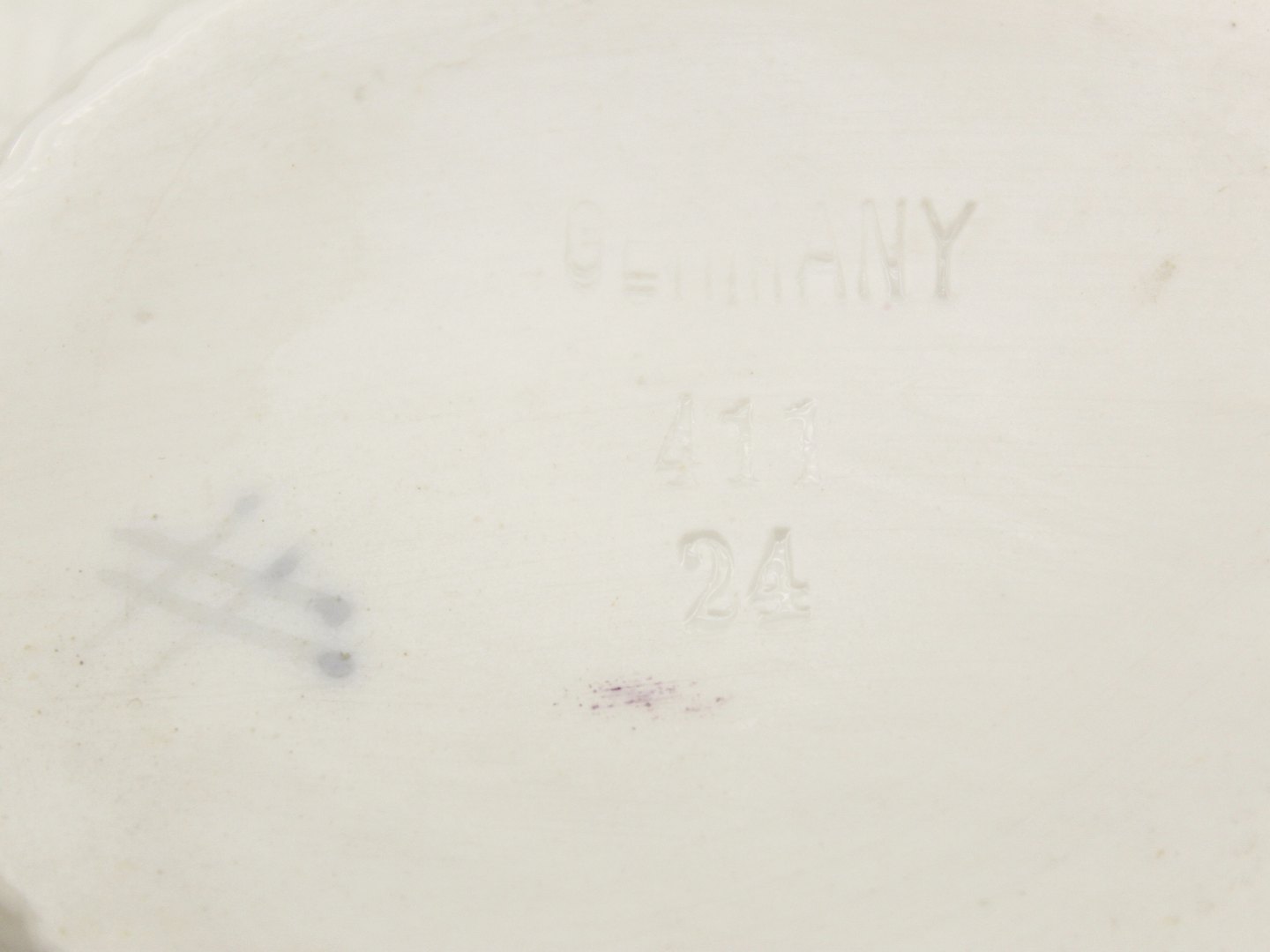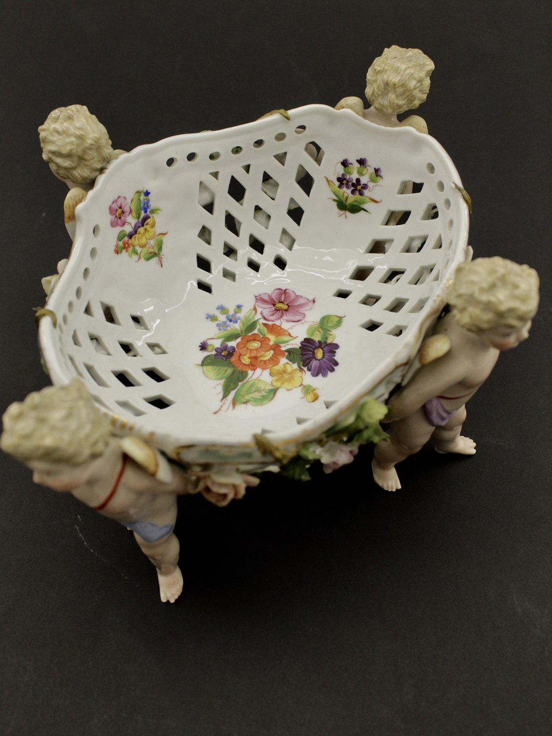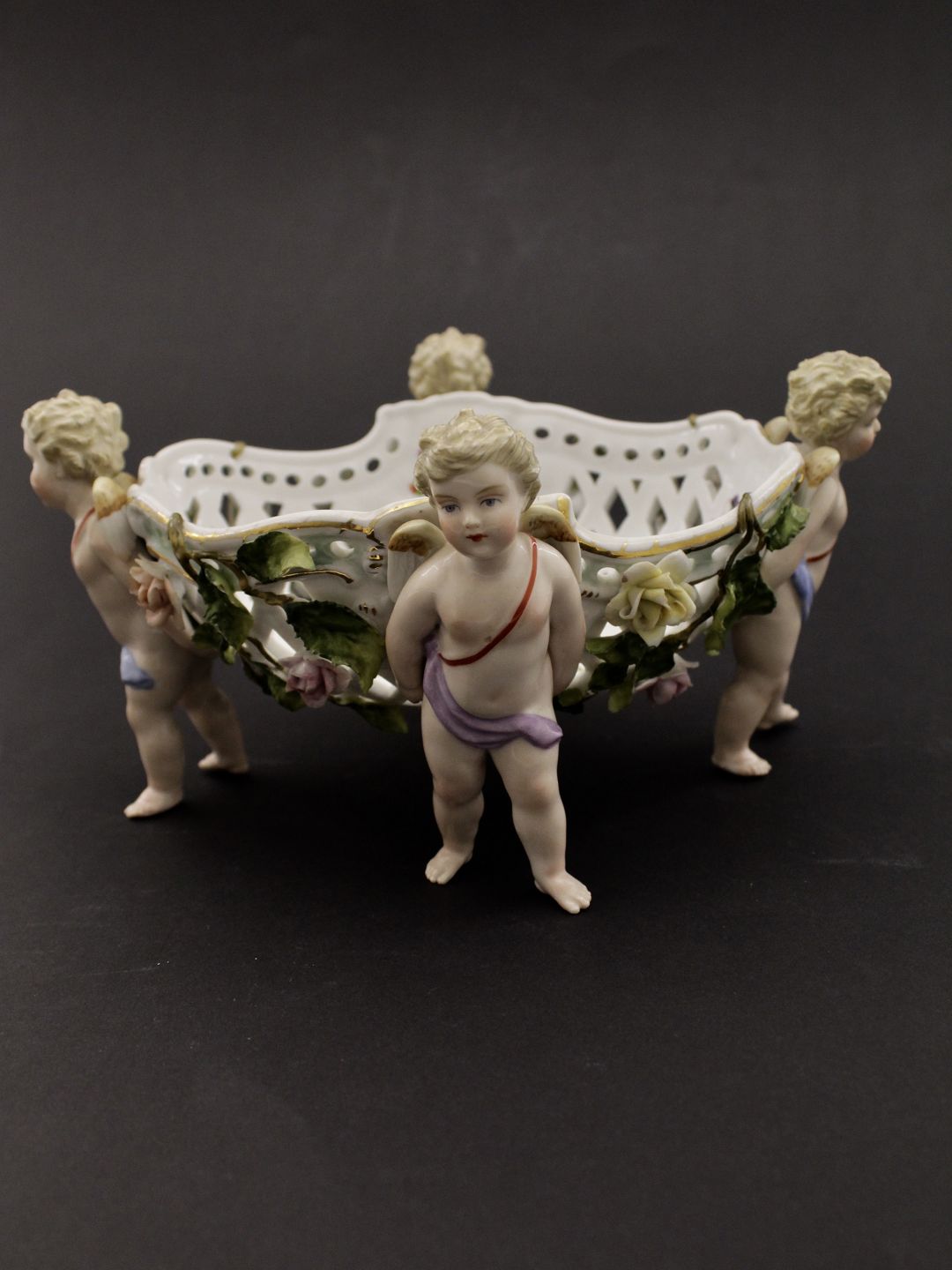 Tysk jardiniere/konfektskål med blomster og putti H. 11,5 cm. og 22x18 Nr. 375202