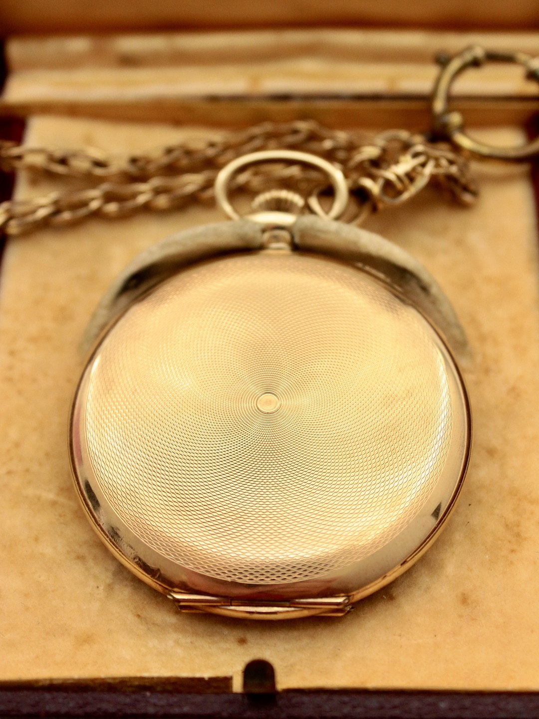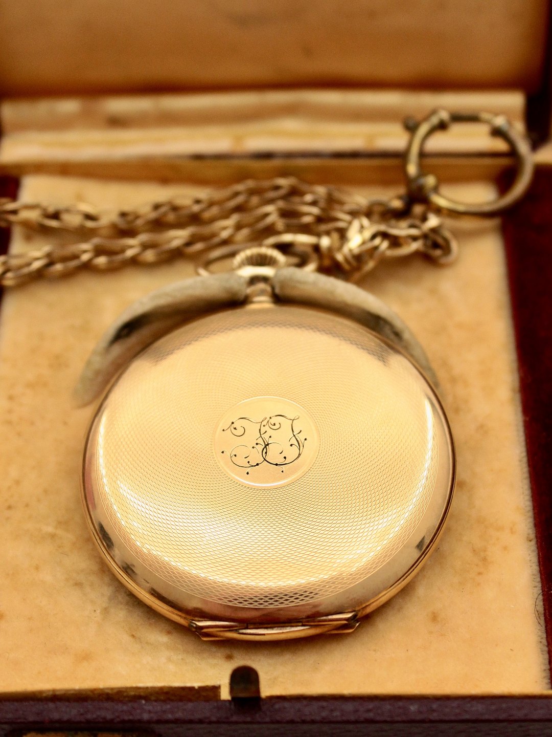 Double-encased gold-plated pocket watch in 1939 dia 5 cm. with engraving chain and original box included no. 393767