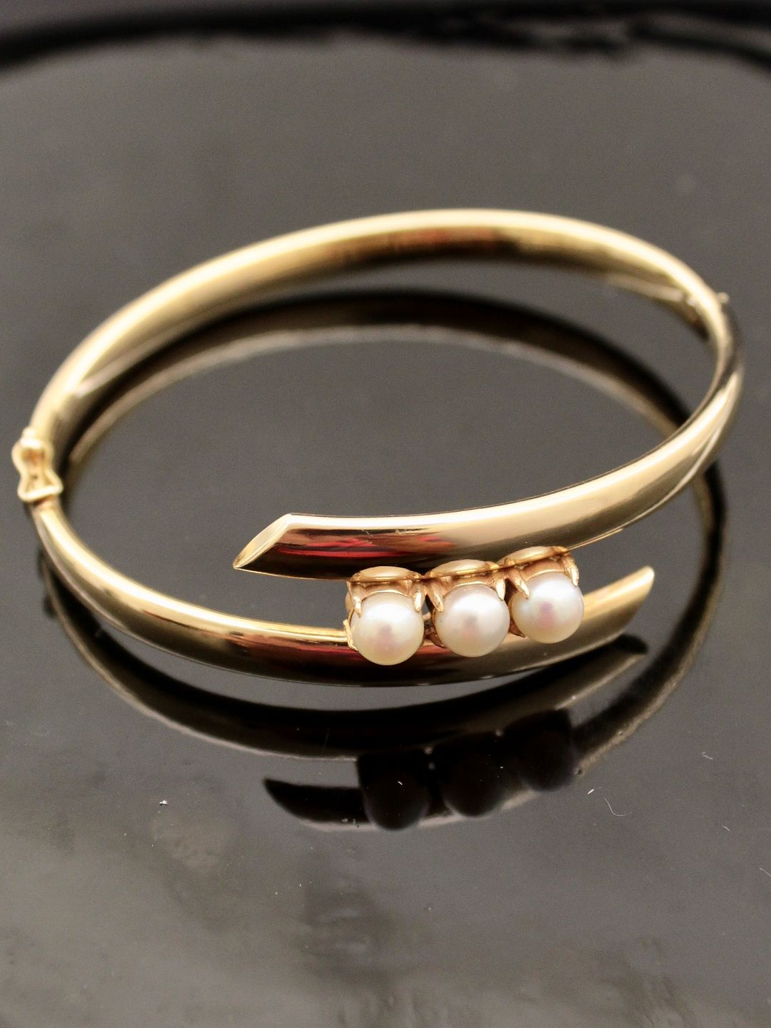 Bernhard Hertz 14 carat gold bangle 6 x 5.2 cm. with 3 genuine pearl stamped BH 585. Nr. 404864