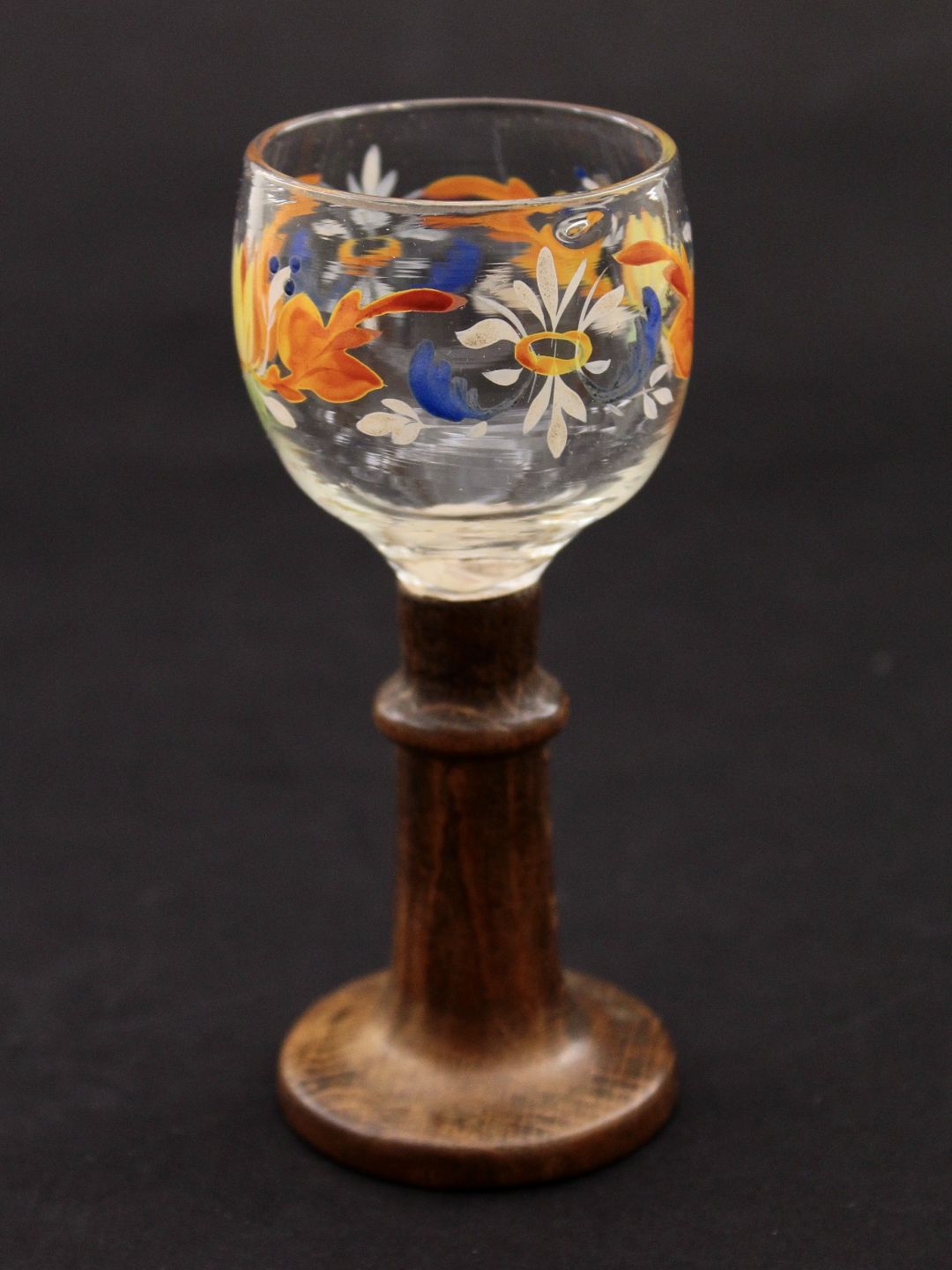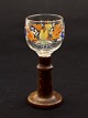 Snaps glass 12 cm. on wooden foot with enamel flowers paint 19.c. item no. 489341