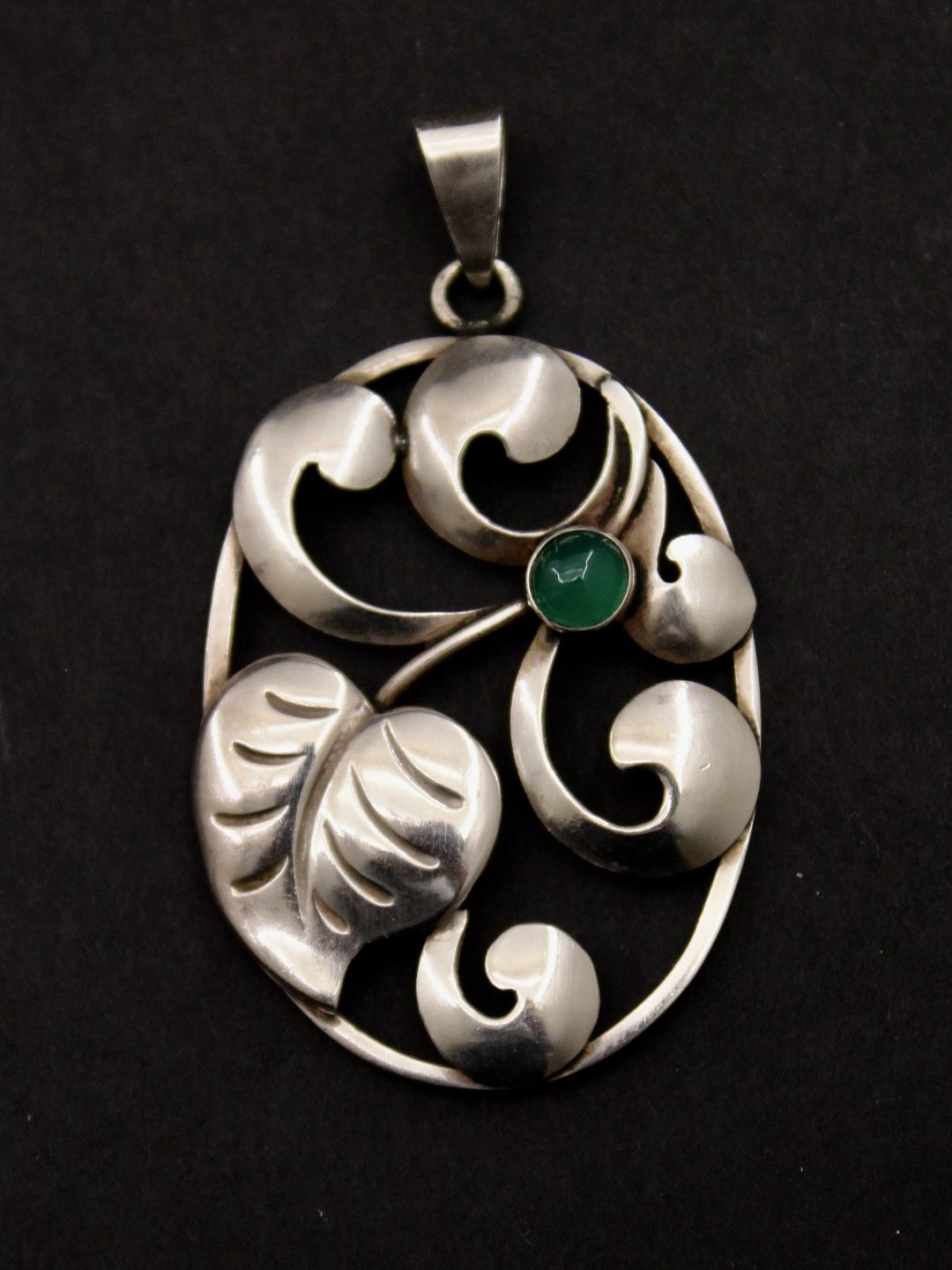 Art nouveau 830 silver pendant 3.5 x 5 cm. with green agate from silversmith Hans Jensen Copenhagen item no. 493982 Stock: 1