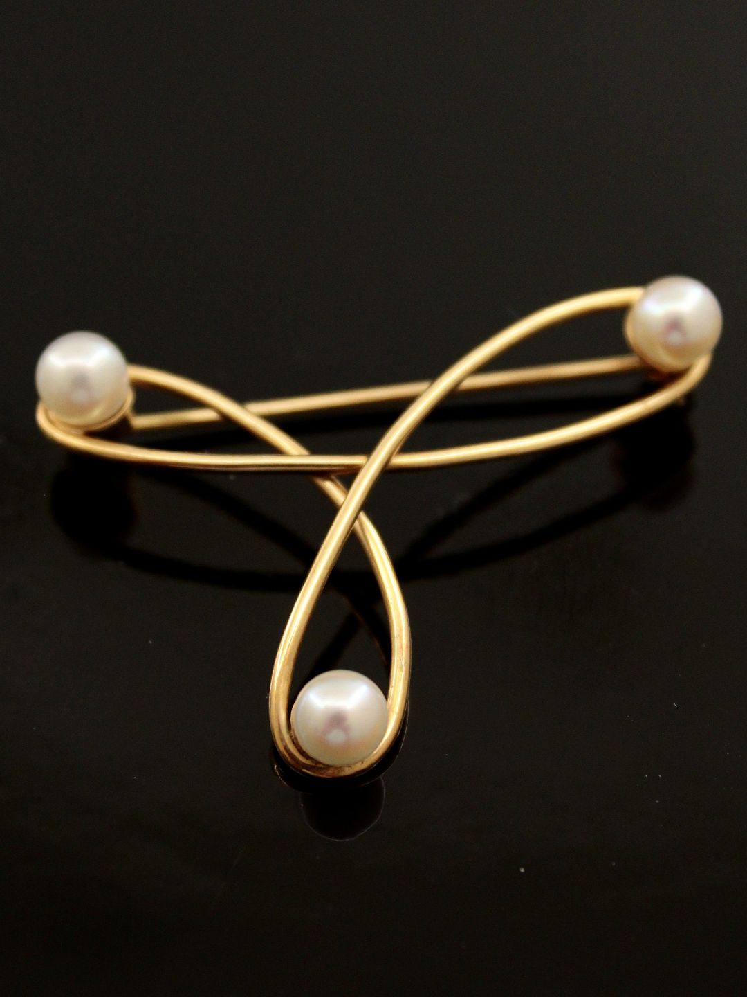 14 karat guld broche 4,2 x 3 cm. med 3 ægte perler fra guldsmed Svend Haugaard Kolding emne nr. 501950