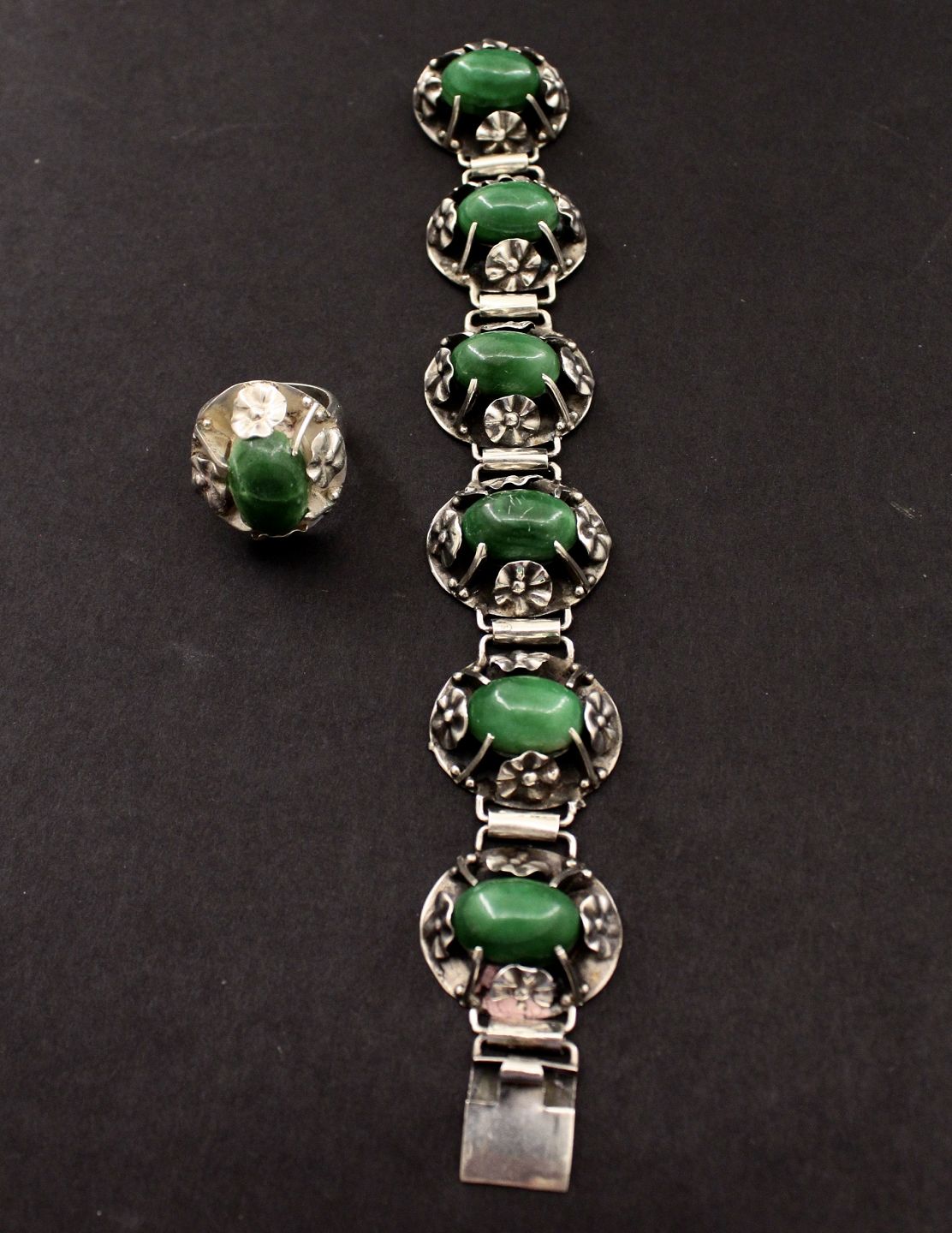 Sterling sølv smykke sæt med grønne stene armlænke 18,5 cm. ring størrelse 53 emne nr. 504863