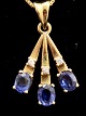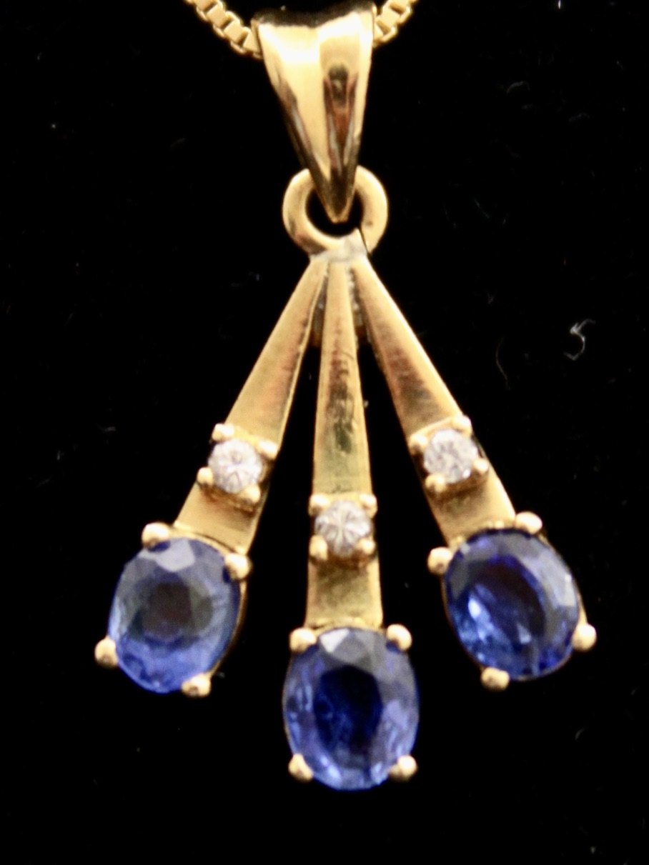 18 carat pendant 1.5 x 1.3 cm. with small diamonds and sapphires and chain 43 cm. Item No. 508044