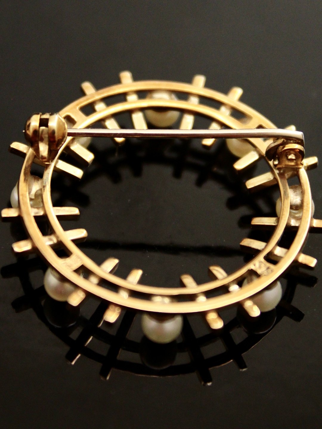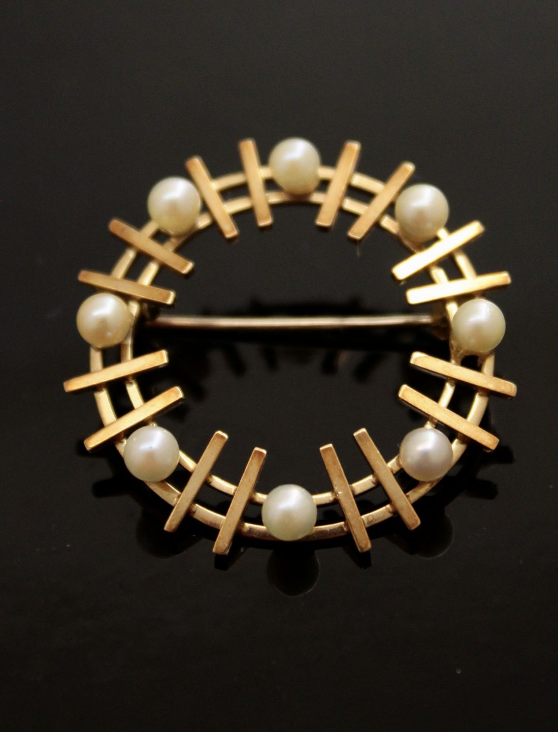 14 carat gold brooch D. 3.4 cm. with genuine pearls from jewelers Herman Siersb�l Copenhagen item no. 508645