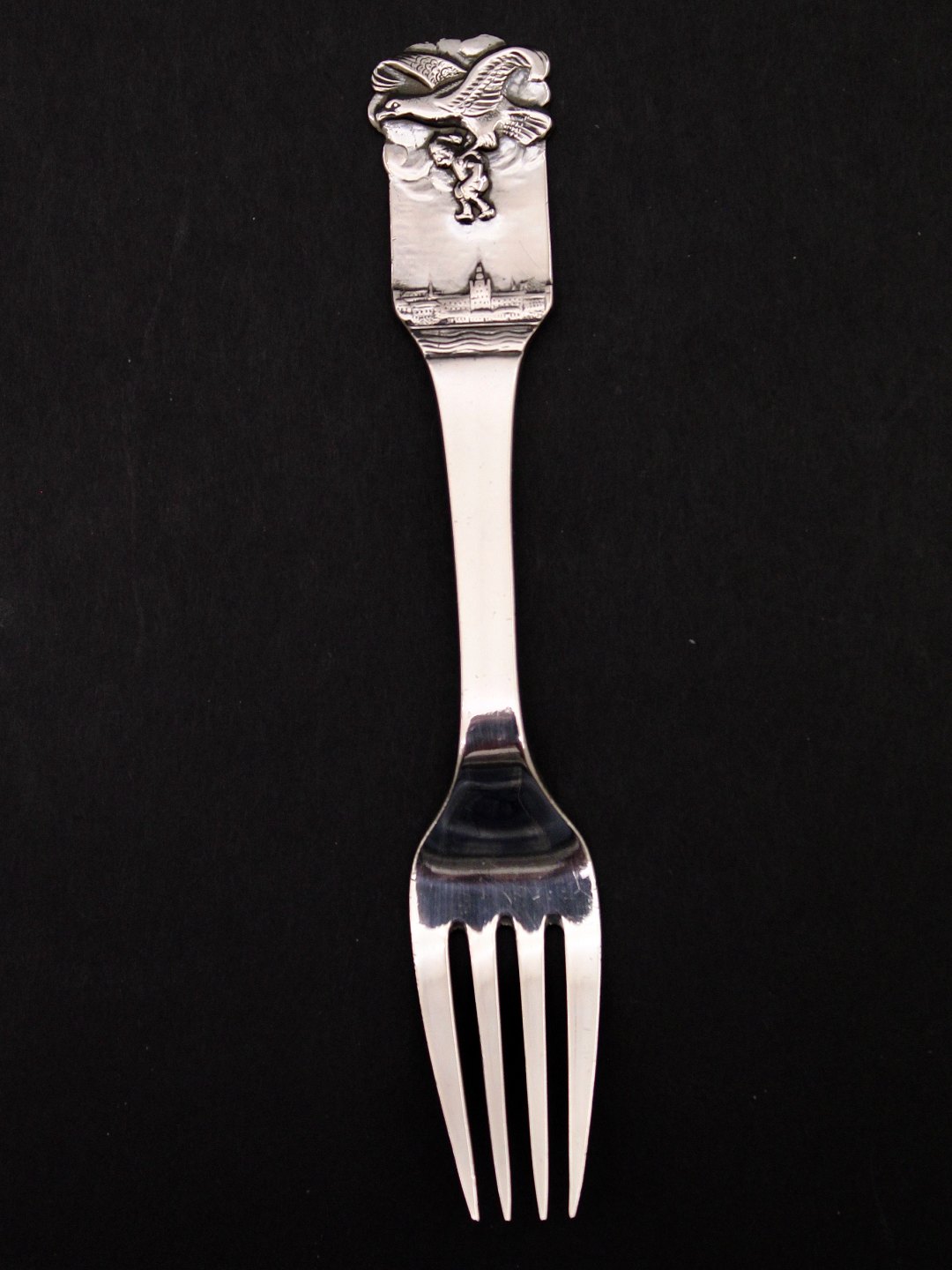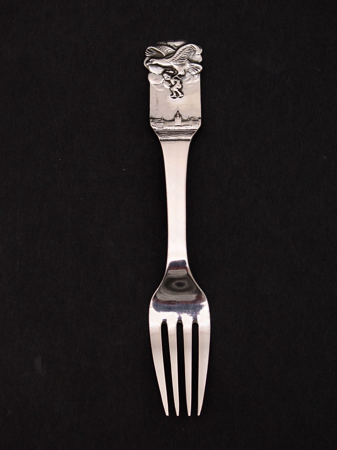 A Dragsted barne gaffel "Niels Holgersens Forunderlige Rejse" 14,5 cm. tretårnet sølv flot ingen graveringer emne nr. 530696